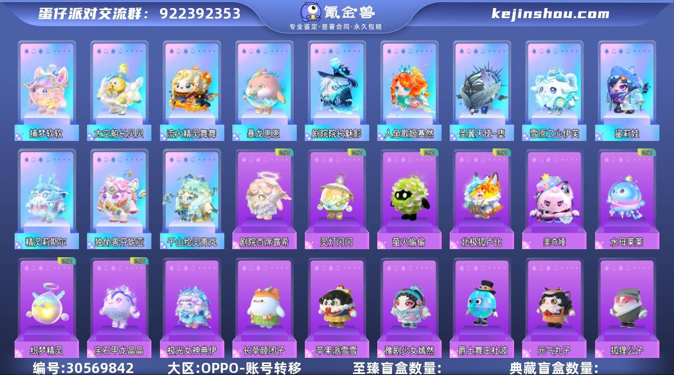 暴龙崽崽,捕梦软软,独角兽芬妮亚,精灵莉斯尔,剧院院长魅影,流火精灵舞舞,千山绘灵青岚,人鱼歌姬赛然,鲨莉娃,圣翼天使-堕,太空船长贝贝,雪原之心伊芙 北极狐卢比,宝石甲龙晶晶,极光女神典伊,剧院首席露希,灵灯闪闪,美奇娅,水母莱莱,萤火偷偷,织梦精灵,嗷嗷,白菜狗,北极兔卢米,北极熊安安,菠萝吹雪,菠萝苏苏,波泡儿,八音盒温妮,白衣天使兰达,长草颜团子,彩虹水波蛋,菜鸟笨笨,橙留香,沉眠的螺壶,催眠师困困,茨木童子,超燃蛋小红,超燃蛋小黄,超燃蛋小绿,仓鼠米仔,唱诗少年弗恩,刺猬绷绷,大亨波利,大灰狼,迪迦,道具师芙芙,DongDong,袋鼠嘟宝,发美美,飞天小猪班尼,沸羊羊,骨精灵,盖碗茶青青,旱獭,猴吼吼,狐狸公子,虎皮卷大灰狼,花如意,胡桃可露丽,灰太狼,航天员莱卡,红小豆,幻想毛怪,海藻偷偷,杰瑞,甲龙晶晶,爵士舞王杜波,吉他手卡萝,酒吞童子,街头一霸骐哥,京剧少年封闲,巨星黛丽,机械鼓手贝克,剑侠客,机械师维迪,考拉阿哦,梨花诗,李建勋,流浪小象哆哆,狸猫大力,蓝舞鞋瑞拉,陆小果,蓝樱爱丽丝,鲤鱼姬小锦,懒羊羊,面包狗松松,蜜蜂DongDong,蜜蜂云云,玫瑰骑士,梅海海,莓莓甜心兔,木偶波露,美羊羊,苹果派雪雪,貔貅福福,巧脆骑士,企鹅心心,饶舌诗人,水波蛋,松饼小红帽,上官子怡,三角龙小萨,赛罗,食梦公爵莱斯,水母尤莱亚,神兽嘲风,松鼠多粟,松山山,石心船长苏勒,失心熊,神月将军夜魄,泰菲,汤姆,天狗刑云,淘气丸子,涂山浅浅,豚豚服务员,兔仙,甜心猫萝拉,王子蒙斯特,熊大,熊二,雪怪瓦图鲁,小灰灰,小红帽,熊猫岁岁,仙人掌丘丘,小太阳葵葵,雪王,星云咩咩,小鹦鹉BEBE,喜羊羊,小演员露希,洗澡DUCKOO,小猪妖,鸭鸭DongDong,萤草班主任,云村音音,豫剧少女嫣然,郁金香贝尔,御狸奴,乐迷艾可,元气丸子,圆舞绮步可可,鹦鹉芝芝,音乐家蕾利,吟游诗人弥亚,圆圆子,啄木鸟琳达,赞萌露比,渔女,章鱼主厨,仔仔熊,猪猪侠 段位:三阶鸡蛋 卖家说:退游号