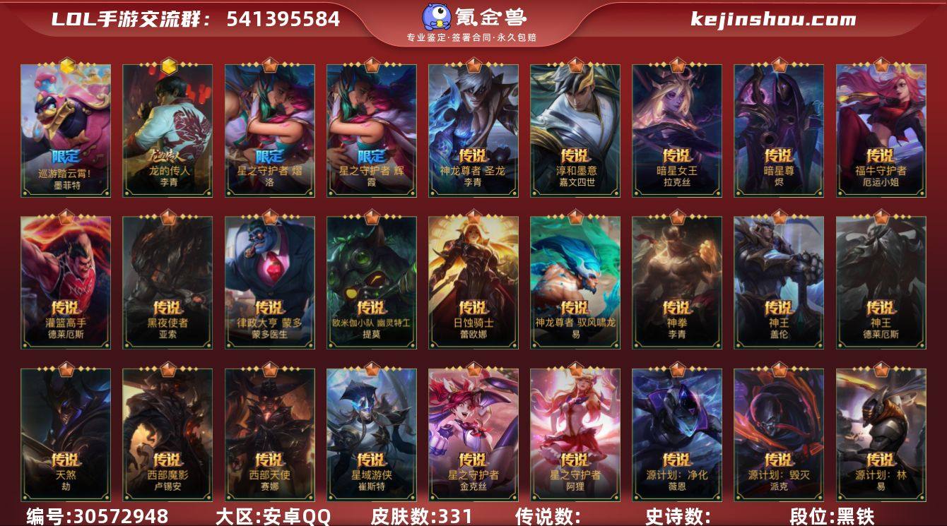 【LSC349】133英雄/331皮肤/流光翡翠/夜星流火 金克丝/龙的传人/巡游踏云霄!墨菲特/满弓镇魂 箭无虚发 韦鲁斯/创星之灵/钢铁军团拉克丝/赵云子龙/虎痴之拳/涂鸦小队艾克/山海绘卷狗熊/神王盖伦/暗星女王拉克丝/心之钢凯隐/源计划:净化/星之守护者金克丝/暗星尊/星域游侠卡牌/星之守护者卡莎/太空律动机器人/黑夜使者亚索/星之守护者阿狸/天煞劫/星域武神贾克斯/西部魔影卢锡安/日蚀骑士蕾欧娜/欧米伽小队 幽灵特工/星之守护者 辉/星之守护者 熠/淳和墨意 嘉文四世/神拳盲僧/神龙尊者 圣龙 李青/律政大亨/福牛守护者女枪/跳跳倩影女枪/源计划:林/神龙尊者 驭风啸龙/灌篮高手/神王诺手/源计划:联合/战斗学院ez/最终BOSS维迦/西部天使赛娜/源计划:毁灭/钢铁军团/霸天剑魔亚托克斯/腥红之月剑魔/星之守护者拉克丝/睡衣守护者拉克丝/惊悚派对/地狱火阿木木/劲道美味 阿木木/黎明使者卡尔玛/星域先知(可升级)/丧尸努努/太空律动努努/小蜜蜂努努和威朗普/地狱行者猴子/探梦奇旅艾克/暗星发条/星之守护者发条/腥红之月皎月/无限烈焰/恶魔之刃/端劲墨印 泰达米尔/赵云 子龙/猎龙勇士赵信/霸天异形螳螂/暗星螳螂/末路管家/猛虎布隆/礼物选好了吗? 布隆/西部牛仔/灭迹行者烬/霸天龙神龙王/圣龙/腥红之月卡牌/未来战士卡牌/弹幕天使/电玩女神卡莎/神龙尊者 玉境灵龙/魅惑女巫莫甘娜/玉剑传说 苍鸾/K/DA ALL OUT寡妇/清剿小队潘森/铁血女忍/K/DA ALL OUT阿卡丽/源计划:火/泳池派对剑姬/玉剑传说 无双/福牛守护者剑姬/苹果机器人/战场之王机器人/海之歌萨勒芬妮/银河魔装机神安妮/福牛守护者安妮/战场之王亚索/电玩女神阿狸/K/DA ALL OUT阿狸/幻梦甜心阿狸/源计划:阴/灵能特工劫/玉剑传说 无劫/武神/源计划:山/泳池派对蕾欧娜/欧米伽小队 魔鬼伞兵/小恶魔/我,羽饰骑士 崔丝塔娜/娜就去看看/预备备!砰! 崔丝塔娜/...