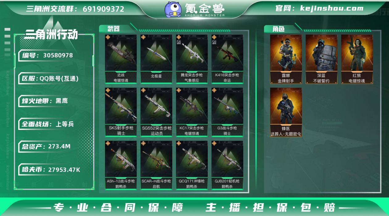 实名: 不可修改 烽火地带段位: 黑鹰 全面战场段位: 上等兵 总资产: 273400000 哈夫币: 27953472 传说武器皮肤: K416突击步枪-命运(典藏),腾龙突击步枪-气象感应(典藏),近战-北极星,K437突击步枪-北极星,QCQ171冲锋枪-北极星,725双管霰弹枪-送葬人-无题密令,M4A1突击步枪-阿米娅,CAR-15突击步枪-阿米娅,复合弓-黑-天际线,AWM狙击步枪-捞点薯条,腾龙突击步枪-捞点薯条,93R-捞点薯条,AK-12突击步枪-特斯拉线圈,SR-3M紧凑突击步枪-特斯拉线圈,UZI冲锋枪-特斯拉线圈,勇士冲锋枪-能天使-午夜邮差,M250通用机枪-骑士之心,近战-电锯惊魂,S12K霰弹枪-电锯惊魂,M14射手步枪-电锯惊魂,SCAR-H战斗步枪-启航,ASh-12战斗步枪-鹅鸭杀,QCQ171冲锋枪-鹅鸭杀,QJB201轻机枪-鹅鸭杀,G3战斗步枪-骑士,KC17突击步枪-电锯惊魂,SG552突击步枪-运动员,SKS射手步枪-骑士 史诗武器皮肤: Vector冲锋枪-阿萨拉文明,AUG突击步枪-蝮蛇,M700狙击步枪-蝮蛇,PKM通用机枪-蝮蛇,MP7冲锋枪-原型机(典藏),AK-12突击步枪-原型机(典藏),SV-98狙击步枪-林中猎手,M250通用机枪-囚徒,SCAR-H战斗步枪-囚徒,腾龙突击步枪-无垢,MP7冲锋枪-无垢,PSG-1射手步枪-无垢,SVD狙击步枪-荒野求生,SR-3M紧凑突击步枪-荒野求生,PKM通用机枪-荒野求生,M16A4突击步枪-竞赛选手,P90冲锋枪-紧急戒备,AWM狙击步枪-无极限,ASh-12战斗步枪-无极限,Mini-14射手步枪-守护者,K437突击步枪-守护者,复合弓-守护者,MP7冲锋枪-守护者,M249轻机枪-异域战争,勇士冲锋枪-工业狂潮,SR-3M紧凑突击步枪-战术竞备,MP5冲锋枪-战术竞备,G3战斗步枪-流沙送葬,AWM狙击步枪-流沙送葬,AS Val突击步枪-百步穿杨,M700狙击步枪-百步穿杨,Vector冲锋枪-百步穿杨,M7战斗步枪-百步穿杨,Vector冲锋枪-异域战争,G3战斗步枪-哈夫克警备,M250通用机枪-寒冬猎手,K416突击步枪-冬日风情,AUG突击步枪-紧急戒备 干员外...