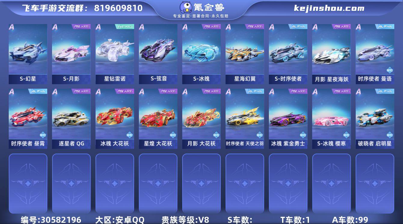 秒换绑【5联赛幻冰月弦时序+2魔法套】 A车数量99 游戏等级84 贵族等级8 车皮肤数量10 【安卓QQ】 【可以正常转区】 【暂时不可修改】 【V8】 永久T车1 永久A车8 S联赛车皮肤11 女魔法时装2 竞速宠20 道具宠19 永久T车:T鸭宝超人; 永久A车:星海幻翼,S冰魄,S时序使者,S月影,S幻星,星钻雷诺,S弦音,冰火圣歌; S联赛车皮肤:冰魄樱寒,冰魄紫金勇士,冰魄大花袄,月影大花袄,月影星夜海妖; 女魔法时装:倾世之礼女装,凌霜雪姬女装; 竞速宠:白龙马,女娲,蔷薇公主,玉玺神虎,小悟空,涂鸦精灵,婵娟,魔法星喵,猩红玫瑰,星魂十夜,铠甲战士,喵酷设计师,蓝焰冰狐,嗷呜,金凯傲甲,玄火之神,月下玫瑰,叮当花鼠,潮汐之灵,雪熊灵宝; 道具宠:极地龙龟,彩虹独角兽,星梦精灵,琵琶精,姜子牙,炎晶魔龙,机甲金刚,拂光掠影·梦羽,盛夏碎冰,迪路兽,花间少女,花灵兽,深海灵姬,王牌怪咖,软糯甜心,璃梦花仙,咏叹歌灵,流萤夜火,花田少女;