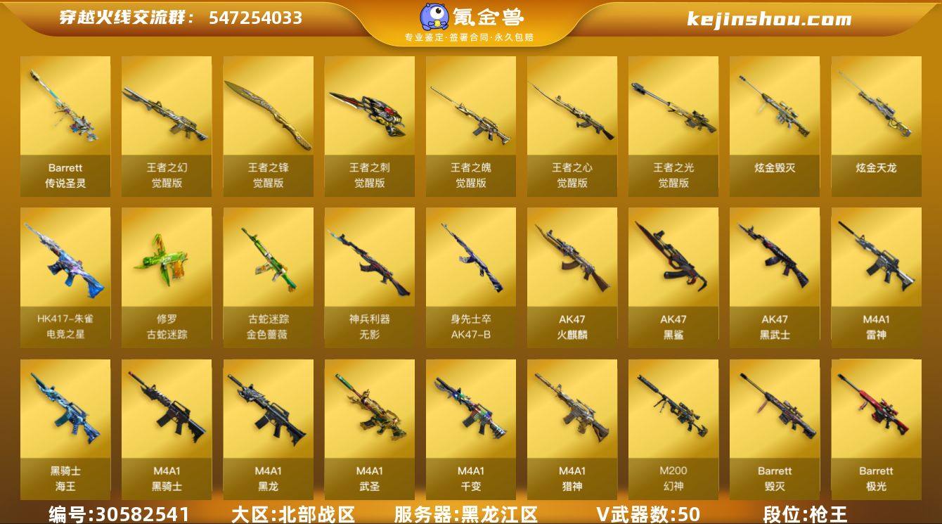 段位:枪王 V武器数:50 王者武器数:7 炫金武器数:2 传说圣灵 王者之幻-觉醒版,王者之锋-觉醒版,王者之刺-觉醒版,王者之魄-觉醒版,王者之心-觉醒版,王者之光-觉醒版 炫金毁灭,炫金天龙 HK417-朱雀-电竞之星,修罗-古蛇迷踪,金色蔷薇-古蛇迷踪,无影-神兵利器,AK47-B-身先士卒,AK47-火麒麟,AK47-黑鲨,AK47-黑武士,M4A1-雷神,黑骑士-海王,M4A1-黑骑士,M4A1-黑龙,M4A1-武圣,M4A1-千变,M4A1-猎神,M200-幻神,Barrett-毁灭,Barrett-极光,蔷薇大炮,AWM-天龙,Kar98k-星神,AK12-天启,屠龙,龙啸,麒麟刺,擎天,柯尔特-荣耀世冠,擎天-竞技荣光,AK47-B-常胜将军,Barrett-暗月传说,斩神刀-雷暴,AK47-B-战士,AK47-B-战神,AK-47-猩红传说,裁决,雷神-荣耀世冠,龙啸-烈火龙威 王者-魅影 零,王者春 M200-幻神音效卡,M4A1-黑骑士音效卡,Barrett-毁灭音效卡,M4A1-雷神音效卡,AK47-火麒麟音效卡 卖家说:王者荣耀有点皮肤
