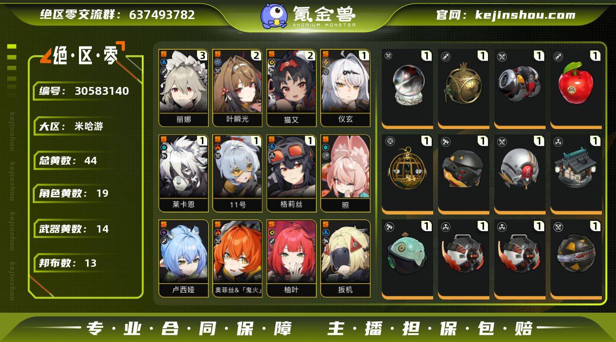 冒险等级:60 总黄数:44 菲林底片数量:300 菲林数量:2523 加密母带数量:2 五星角色数:19 3命丽娜,2命叶瞬光,2命猫又,1命仪玄,1命莱卡恩,1命「11号」,1命格莉丝,0命照,0命卢西娅,0命奥菲丝&「鬼火」,0命柚叶,0命扳机,0命零号·安比,0命耀嘉音,0命浅羽悠真,0命星见雅,0命青衣,0命艾莲,0命珂蕾妲 五星武器数:14 1精云霓孤光,1精铸梦炉歌,1精嚣枪喧焰,1精狸法七变化,1精青溟笼舍,1精索魂影眸,1精牺牲洁纯,1精霰落星殿,1精玉壶青冰,1精嵌合编译器,1精硫磺石,1精燃狱齿轮,1精钢铁肉垫 邦布数量:13 4精格列佛探员,3精狮耶,2精艾丝弥小姐,2精咔嚓仔,2精鲨牙布,1精芽芽,1精比克布利克,1精墨丘利,1精罗宾,1精赤红莫库斯,1精巴特勒,1精飚速布,1精插头布 白心旧影,狡黠甜心,墨形影踪,暖霞拾光,晴澜双迹套装,漪光夜曲