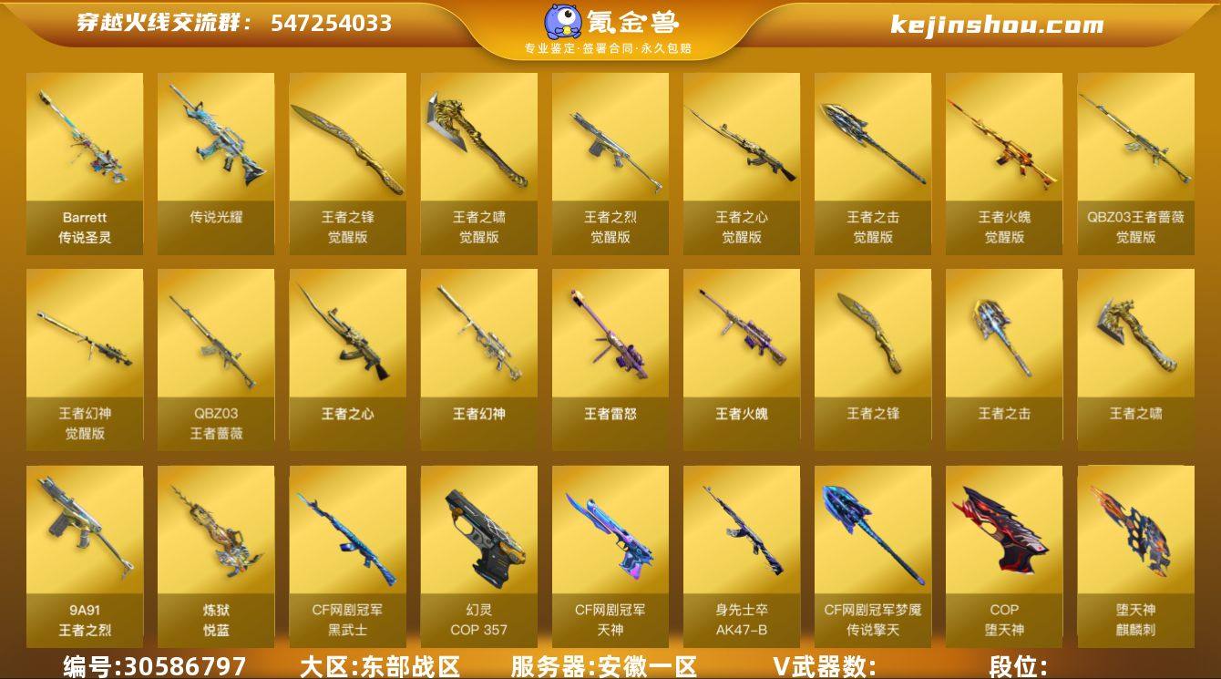 L626805 【传说光耀(2537序列号)/传说圣灵/幻神三件套(音效卡+冠军之幻+AGS17+周瑜)/裁决/白虎/王者幻神/王者蔷薇/蝴蝶+烈龙*6/盘龙*6+炼狱/COP幻灵*2/COP堕天神*2/四防影豹+王者春+貂蝉+春雅灵花+职业经理/音效卡+毁灭+火麒麟+极光+黑骑士/皮肤:雷神-R.LGD+杨戬/毁灭-张飞+CFS2020/】 会员等级0 英雄级武器数量132 【可二次实名】 【永久包赔】 【能人脸包赔】 【VIP 0】 【能排位】 【传奇】 稀有套装2 传说武器2 王者炫金武器11 热门武器6 英雄级武器37 稀有武器10 暴走生化4 挑战大师5 角色10 稀有皮肤22 音效卡6 投掷武器8 稀有套装:幻灵套,堕天神套; 传说武器:传说光耀,传说圣灵; 王者炫金武器:闪光弹-雷霆王者,王者雷怒,王者之烈,王者幻神,炼狱-悦蓝,王者之击,王者之心,QBZ-03-王者蔷薇,王者火魄,王者之啸,王者之锋; 热门武器:COP 357-幻灵,Scar Light-白虎,M200-幻神,COP-堕天神,斯泰尔-蝴蝶,金刚伞; 英雄级武器:麒麟刺-百战金芒,无影-神兵利器,AK47-火麒麟,9A-91-烈火,天神-CF网剧冠军,黑武士-CF网剧冠军,擎天-CF网剧冠军,AWM-裁决,沙鹰-修罗,M4A1-幻灵,幻灵之锋,AK47-黑武士,AK47-无影,AK47-黑鲨,M4A1-龙血,M4A1-猎神,RPK-盘龙,汤姆逊-烈龙,加特林-炼狱,M4A1-死神,Barrett-毁灭,AK-47-猩红传说,Barrett-暗月传说,AK47-B-常胜将军,AK47-B-战士,AK47-B-身先士卒,沙鹰-天神,屠龙,Barrett-极光,擎天,M4A1-堕天神,龙啸-堕天神,麒麟刺-堕天神,M4A1-黑龙,M4A1-黑骑士,M4A1-雷神,AWM-天龙; 稀有武器:天龙-曼陀罗,迷你波特博士,迷你白狐,加利尔ACE-零号,迷你裂空之翼,AWM-灵狐-15周年嘉年华,雷神-小红,牛牛-AK47,QBZ03-吕布,巴雷特-零-水下丽影; 暴走生化:轻型军用手斧-镜,女皇终结者-魔龙之吻,6盘龙,6烈龙; 挑战大师:VEPR-...