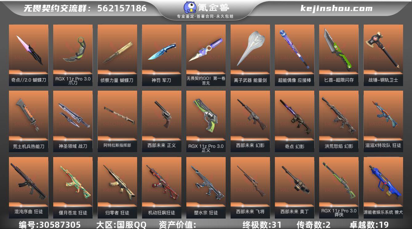【套装】:西部未来套装,RGX 11z Pro//3.0套装,般若假面//2.0套装,掠影套装,耀鳞威龙套装,离子武器套装【英雄】:幻棱,炼狱,维斯,暮蝶,钛狐,壹决,铁臂,捷风,雷兹,幽影,不死鸟,贤者,猎枭,蝰蛇,零,芮娜,奇乐,尚勃勒,霓虹,斯凯,夜露,星礈,K/O,海神,盖可,黑梦,钢锁【近战武器】:近战武器-无畏契约GO!第一卷 苦无,近战武器-侦察力量 蝴蝶刀,近战武器-奇点//2.0 蝴蝶刀,近战武器-紫金爪刀,近战武器-RGX 11z Pro//3.0 爪刀,近战武器-威龙之刃,近战武器-鬼丸国纲,近战武器-未来开拓者,近战武器-离子武器 能量剑,近战武器-超能偶像 应援棒,近战武器-超限闪存 匕首,近战武器-钢轨卫士 战锤,近战武器-荒土机兵 热能刀,近战武器-神罚 军刀,近战武器-影刃,近战武器-神圣领域 战刀,近战武器-阿特拉斯指挥部 甩棍【狂徒】:狂徒-归零者,狂徒-混沌序曲,狂徒-机动狂飙,狂徒-塑水宗,狂徒-偃月苍龙,狂徒-滋滋X特攻队,狂徒-般若假面//2.0,狂徒-堕天遗武,狂徒-掠影,狂徒-盖亚的复仇,狂徒-海洋之星,狂徒-耀鳞威龙,狂徒-紫阙金琅,狂徒-超能偶像,狂徒-钢轨卫士,狂徒-荒土机兵,狂徒-诡秘蛇影【幻影】:幻影-源能者娱乐系统,幻影-洪荒怒焰,幻影-奇点,幻影-西部未来,幻影-离子武器,幻影-侦察力量,幻影-超限闪存,幻影-神圣领域,幻影-聚合之力,幻影-纳米打击,幻影-战术小伙伴,幻影-末日之翼,幻影-西部未来【戍卫】:戍卫-掠影,戍卫-超能偶像,戍卫-钢轨卫士,戍卫-浮光跃金,戍卫-花漾粉红,戍卫-逆冲蛮牛,戍卫-月球哨兵,戍卫-折光棱晶【獠犬】:獠犬-源能者娱乐系统,獠犬-般若假面//2.0,獠犬-神圣领域,獠犬-采蜜小蜂队,獠犬-模拟赫兹,獠犬-逆冲蛮牛,獠犬-数码咒术,獠犬-战术小伙伴【冥驹】:冥驹-掠影,冥驹-离子武器,冥驹-荒土机兵,冥驹-花漾粉红...