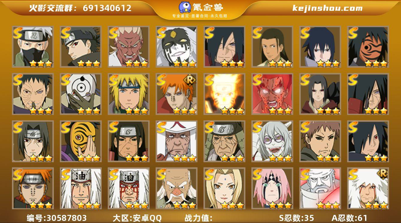 35S级忍者数-61A级忍者数 【S级忍者】:猿飞日斩「秽土转生」(3星),千手柱间「秽土转生」(3星),宇智波鼬「秽土转生」(3星),宇智波斑「秽土转生」(3星),宇智波斑「秽土转生·解」(3星),大野木「忍界大战」(3星),春野樱「忍界大战」(3星),宇智波带土「忍界大战」(3星),艾「忍界大战」(3星),宇智波鼬「须佐能乎」(3星),宇智波止水「须佐能乎」(3星),旗木卡卡西「须佐能乎」(3星),宇智波斑「木叶创立」(3星),千手柱间「木叶创立」(3星),罗砂「四代目风影」(3星),自来也(3星),自来也「仙人模式」(3星),自来也「舞之豪杰」(3星),大蛇丸(3星),纲手(3星),猿飞日斩(4星),波风水门(3星),药师兜「仙人模式」(3星),神秘面具男(3星),神秘面具男「红夜之刃」(3星),漩涡鸣人「九喇嘛连结」(3星),迈特凯「死门」(3星),佩恩「天道」(3星),佩恩·天道「超」(3星),宇智波佐助「永恒万花筒」(3星),宇智波斑 「白面具」(3星宇智波斑「白面具」),大筒木金式(3星),大筒木桃式(3星),波风水门「九喇嘛连结」(3星),漩涡鸣人·宇智波佐助(3星) 【A级忍者】:艾「青年」(2星),长门「青年」(2星),波风水门「青年」(2星),达鲁伊「博人传」(2星),迪达拉(2星),迪达拉「新春限定」(2星),大蛇丸「新春限定」(2星),奇拉比(2星),奇拉比「忍界大战」(2星),飞段(3星),飞段「死司凭血」(4星),干柿鬼鲛(5星),漩涡博人「桃式显现」(2星),漩涡鸣人「仙人模式」(2星),机械鸣人「初始形态」(2星),迈特凯(5星),旗木卡卡西「幻之真容」(2星),桃地再不斩「秽土转生」(2星),我爱罗「疾风传」(4星),我爱罗「新春限定」(2星),蝎(5星),蝎「绯流琥」(2星),小南(2星),小南「新春限定」(2星),小南「夏日泳装」(2星),小南「漂泊浪客」(2星),角都(2星),角都「地怨虞」(2星),角都「晓创生」(2星),猿飞阿斯玛(5...