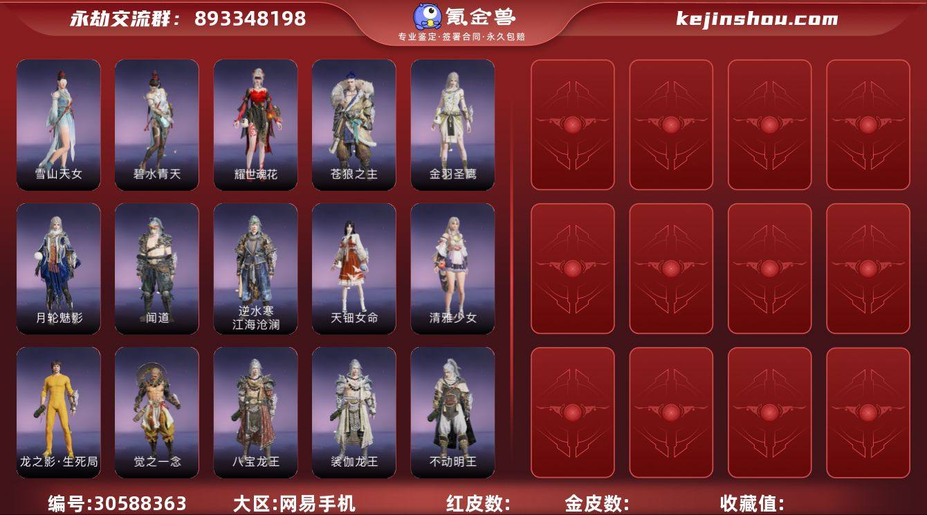 小号 3红97金 红皮: 熛怒炼火(季沧海皮肤),冰魄(长剑皮肤),狼主(阔刀皮肤) t3219 宁红夜金皮: 雪山天女,碧水青天,耀世魂花 特木尔金皮: 苍狼之主 迦南金皮: 金羽圣鹰,月轮魅影 季沧海金皮: 闻道,逆水寒·江海沧澜 胡桃金皮: 清雅少女,天钿女命 天海金皮: 八宝龙王,裟伽龙王,不动明王,觉之一念,龙之影·生死局,若水尊者 岳山金皮: 骁骑,龙之影·过江龙 无尘金皮: 若谷 沈妙金皮: 观山海·腓腓 飞索金皮: 冰链,铁护臂 长剑金皮: 阴阳师·伞剑,华夏神兵·永乐宝剑 太刀金皮: 雷赐,数珠丸,黑绳 阔刀金皮: 听涛,决战平安京·朔方之刃,龙蟠 长枪金皮: 九尺沁金耙,委蛇矛,凌云志,建木,长虹 棍金皮: 学宫之杖 匕首金皮: 鹰吻,华夏神兵·马首刀 双节棍金皮: 玉矩,精武,地火涌,镇魔杵,衔谷 双刀金皮: 破重云,天威 弓箭金皮: 古月,青花 远程金皮: 石中火(鸟铳),炎魔(喷火筒),出渊蛟(鸟铳),吞海鲛(火炮),梦魇(五眼铳),炉中火(五眼铳),金蝎(鸟铳),镇海(连弩) 饰品金皮: 婵娟(崔三娘背饰),雾隐繁花(宁红夜面部),碧玉髓(季沧海面部),虎头帽(特木尔头部),摇清枫(宁红夜后腰),战狼弯角盔(特木尔头部),御狼号角(特木尔左前腰),雪绒帽(迦南头部),雪鹿雄角(季沧海头部),浪焰青藤帽(季沧海头部),火石袋(季沧海右后腰),福虎帽(胡桃头部),蓝樱灯(胡桃左腰),凤尾皂金盔(岳山头部),寒酥银粟(顾清寒头部),妙法兜帽(沈妙头部),伏魔杵(天海右腰),观山海·夏鼓(季沧海右腰),九阴鳞(宁红夜面部)