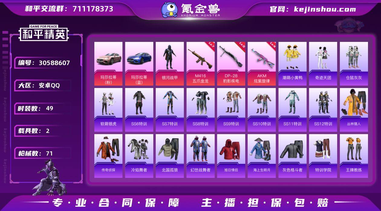 安卓【小号】 手Q-1粉装-3特效枪-2载具-1粉色飞行器-25682热力值-2王牌印记-49套装-71枪皮 【热门品类】:套装-潮萌小黄鸭 【粉色套装】:粉装-银河战甲 【粉色枪皮等级】:AKM-炫紫旋律(四级),M416-五爪金龙(七级),DP-28-豹影疾电(五级) 【粉色载具】:玛莎拉蒂Ghibli(粉),玛莎拉蒂Ghibli(蓝) 【粉色枪皮】:AKM-炫紫旋律,M416-五爪金龙,DP-28-豹影疾电 【粉色降落伞】:银河战甲降落伞,至尊龙雀降落伞,梦幻火箭降落伞,古堡领主降落伞,异瞳寒姬降落伞,炫彩糖果降落伞 【稀有套装】:套装-雪国风尚 【稀有枪皮】:AKM-灼热熔岩,AKM-玉龙,M16A4-红色方程式,SCAR-L-银河战甲,M416-红色方程式,GROZA-春暖花开,GROZA-银河战甲,GROZA-黑色刀锋,QBZ-神秘黑猫,QBZ-银河战甲,M762-奇异狩猎者,M762-绯红前夜,M762-镭射皇者,G36C-不夜海上花,UZI-众神之王,UZI-啾咪啾咪,UMP45-生命誓言,Vector-银河战甲,汤姆逊-天降萌叽,野牛-机械英豪,MP5K-众神之王,MP5K-繁花小夜曲,Kar98K-红色方程式,M24-众神之王,AWM-不夜海上花,SKS-炫彩节奏,VSS-镭射皇者,VSS-黑色刀锋,Mini14-银河战甲,Win94-机械英豪,SLR-众神之王,QBU-不夜海上花,S686-不夜海上花,S686-冰封烈焰,S686-生命誓言,DP-28-锦绣火鲤,MG3-幻世战舞者,P1911-冰封烈焰 【其他套装】:套装-SS6特训,套装-SS7特训,套装-SS8特训,套装-SS9特训,套装-SS10特训,套装-SS11特训,套装-SS12特训,套装-丛林猎人,套装-传奇侦探,套装-冷焰舞者,套装-北国孤狼,套装-奇迹天团,套装-幻世战舞者,套装-旭日情侣,套装-海上生明月,套装-灰色格斗者,套装-特训学院,套装-王牌教练,套装-甜蜜告白,套装-疯狂小兔子,套装-白色伏地魔,套装-竞技勇士朋克,套装-耀粉歌者,套装-跃动心情,套装-青年教官,套装-顽皮玉兔,套装-...