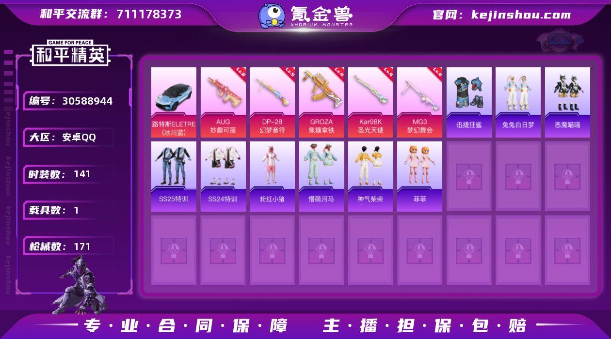 安卓QQ62608热力值 2王牌印记 最高段超级王牌7星 125套装 182枪皮 16粉装 5特效枪 1载具 16剩余点券 102战备 【优质载具】路特斯ELETRE(冰川蓝)【特效枪】GROZA-焦糖拿铁[4级],Kar98K-圣光天使[4级],MG3-梦幻舞会[4级],DP-28-幻梦音符[5级],AUG-妙趣可丽[6级]【粉装】套装-冰霜白皇,套装-山涧鹿灵,套装-蜜桃特工,套装-葫芦兄弟,套装-炙焰赤龙,套装-骨龙祭渊,套装-黑伞漫漫,套装-海渊国主,套装-精灵娃娃,套装-绚丽摇曳,套装-橘柚倾心,套装-赤焰黑爵,套装-紫电风暴,套装-圣光天使,套装-霞光圣骑,套装-寒光使者【套装】套装-红色运动,套装-竞技名士,套装-深蓝色名流,套装-酒红色名流,套装-湖蓝色名流,套装-黄色名流,套装-长空猛禽,套装-蓝色守护者,套装-特战装甲,套装-贵族骑装,套装-特殊使命,套装-灰色格斗者,套装-滨海假日,套装-神秘领域,套装-绮丽涂鸦,套装-热血青春,套装-沙漠兵团,套装-幻世战舞者,套装-迅捷狂鲨,套装-甜蜜熊情侣,套装-冰川特警,套装-忍者信条,套装-海上生明月,套装-粉红小猪,套装-霓虹街区,套装-暗夜契约,套装-萌黄之夏,套装-隐空刺,套装-影双刃,套装-夏日音浪,套装-丝绸行者,套装-抹茶蜜豆,套装-探宝勇士,套装-牛气满满,套装-梦之呓语,套装-诡面顽熊,套装-青春冒险家,套装-潮流游乐家,套装-原初圣火,套装-逆风勇士,套装-萌趣颜团子,套装-特种颜团子,套装-S