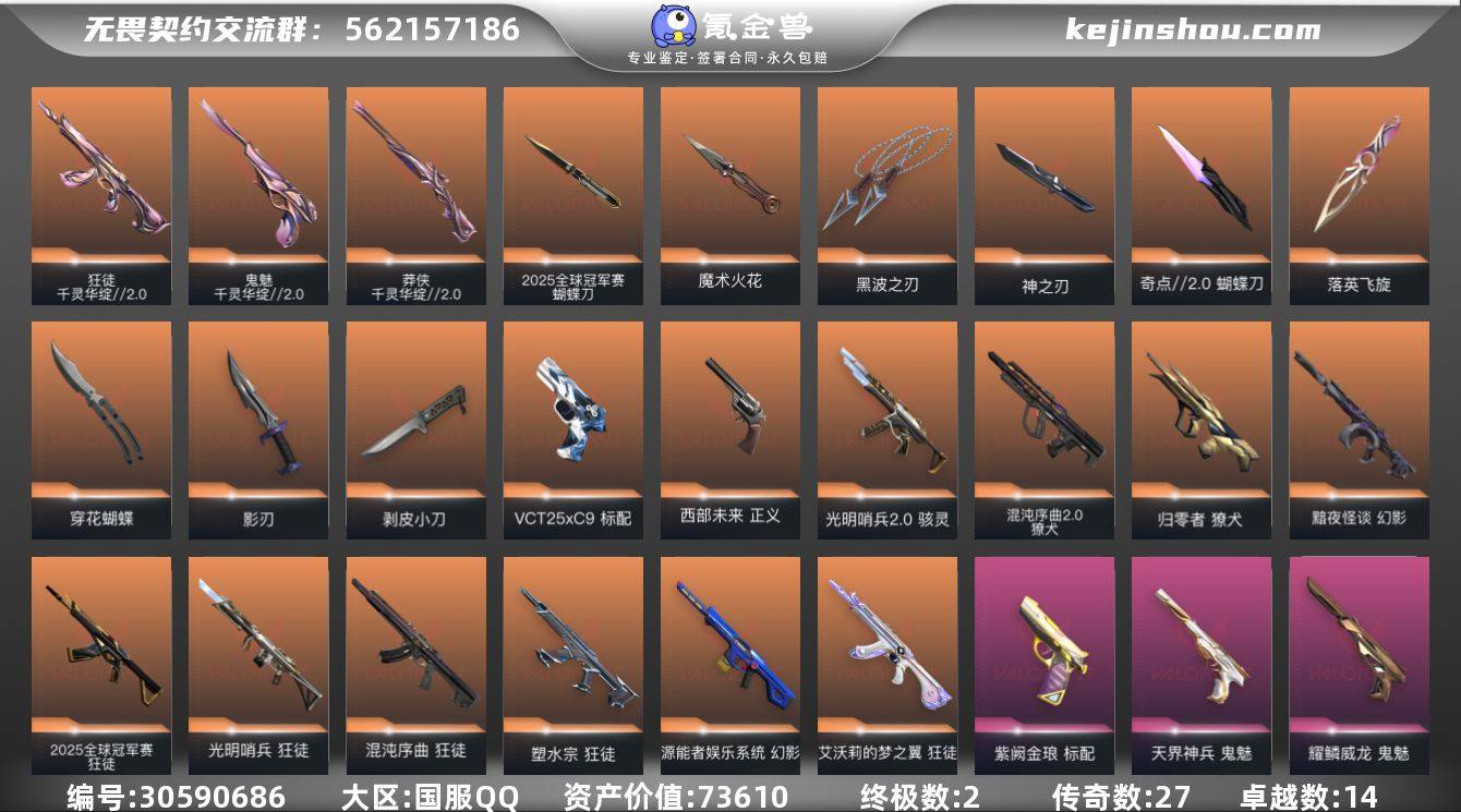 【套装】:西部未来套装,VCT 2025 赛季套装,奇点//2.0套装 【英雄】:幻棱,炼狱,维斯,暮蝶,钛狐,壹决,铁臂,捷风,雷兹,幽影,不死鸟,贤者,猎枭,蝰蛇,零,芮娜,奇乐,尚勃勒,霓虹,斯凯,夜露,星礈,K/O,海神,盖可,黑梦,钢锁 【近战 武器】:近战武器-VCT 2025 爪刀,近战武器-奇点//2.0 蝴蝶刀,近战武器-镭切,近战武器-澄湖潋滟,近战武器-珍珠棘贝 短剑,近战武器-流星兵团 短剑,近战武器-未来开拓者,近战武器-超能偶像 应援棒,近战武器-超限闪存 匕首,近战武器-盖亚之愠,近战武器-荒土机兵 热能刀,近战武器-诡秘蛇影 军刀,近战武器-神圣领域 战刀 【狂徒】:狂徒-混沌序曲,狂徒-奇点//2.0,狂徒-堕天遗武,狂徒-盖世英雄,狂徒-海洋之星,狂徒-耀鳞威龙,狂徒-离子武器//2.0,狂徒-超能偶像,狂徒-荒土机兵,狂徒-流星兵团,狂徒-漫天彩霞,狂徒 诡秘蛇影 【幻影】:幻影-黯夜怪谈,幻影-光明哨兵//2.0,幻影-西部未来,幻影-般若假面,幻影-超限闪存,幻影-珍珠棘贝,幻影-神圣领域,幻影-聚合之力,幻影-纳米打击,幻影-末日之翼,幻影-西部未来 【戍卫】:戍卫-破败军械,戍卫-超能偶像,戍卫-珍珠棘贝,戍卫-浮光跃金,戍卫-逆冲蛮牛,戍卫-战术熊与伙伴们,戍卫-月球哨兵,戍卫-折光棱晶 【獠犬】:獠犬-781-A协议,獠犬-归零者,獠犬-漫天彩霞,獠犬-神圣领域,獠犬-采蜜小蜂队,獠犬-复古浪潮,獠犬-模拟赫兹,獠犬-逆冲蛮牛 【冥驹】:冥驹-堕天遗武,冥驹-荒土机兵,冥驹-复古浪潮,冥驹-模拟赫兹,冥驹-星云暗涌 【飞将】:飞将-塑水宗,飞将-西部未来,飞将-聚合之力,飞将-战术熊与伙伴们,飞将-末日之翼 【莽侠】:莽侠-RGX 11z Pro//3.0,莽侠-超限闪存,莽侠-诡秘蛇影,莽侠-深海水族,莽侠-纤云弄巧,莽侠-月球哨兵 【战神】:战神-神圣领域,战神-采蜜小蜂队,战神-浮光跃金,战神-深海水族 【奥丁】:奥丁-全息波普,奥丁-西部未来,奥丁-流星兵团,奥丁-纳米打击,奥丁-末日之翼 【判官】:判官-偃月苍龙,判官-超能偶像,判官-诡秘蛇影,判官-采蜜小蜂队,判官-纳米打击x 【雄鹿】:雄鹿-离子武器,雄鹿-复古浪潮,雄鹿-模拟赫兹,雄鹿-逆冲蛮牛,雄鹿-月球哨兵 【骇灵】:骇灵-光明哨兵//2.0,
