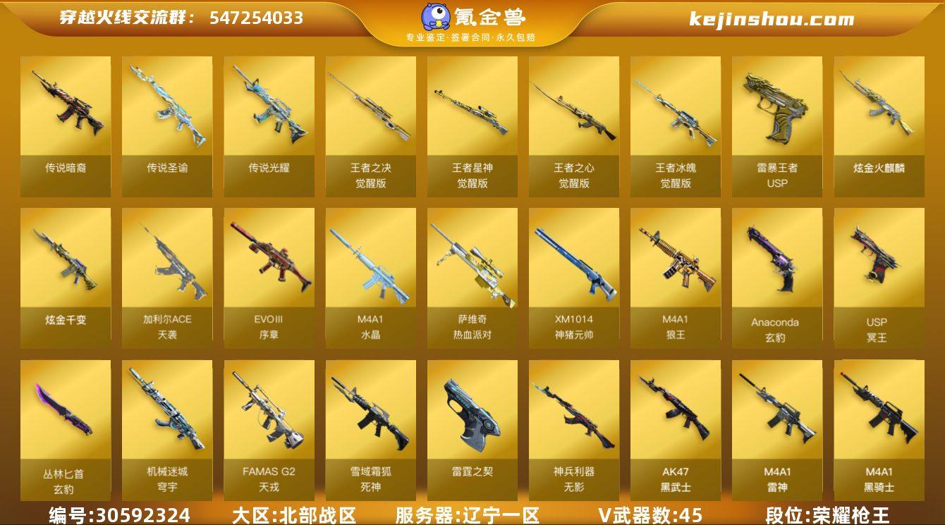 段位:荣耀枪王 VIP等级:VIP3 V武器数:45 王者武器数:6 炫金武器数:2 传说暗裔,传说光耀,传说圣谕 王者之决-觉醒版,王者星神-觉醒版,王者之心-觉醒版,王者冰魄-觉醒版,USP雷暴王者 炫金火麒麟,炫金千变 EVOⅢ-序章,加利尔ACE-天袭,M4A1-狼王,M4A1-水晶,萨维奇-热血派对,XM1014-神猪元帅,Anaconda-玄豹,丛林匕首-玄豹,USP-冥王,机械迷城-穹宇,FAMAS G2-天戎,死神-雪域霜狐,雷霆之契,无影-神兵利器,AK47-黑武士,M4A1-雷神,M4A1-黑骑士,M4A1-黑龙,M4A1-武圣,Barrett-毁灭,Barrett-极光,AA-12-雷霆,AK12-天启,9A91-烈火,屠龙,龙啸,麒麟刺,擎天,M200-竞技荣光,柯尔特-竞技荣光,擎天-竞技荣光,裁决,天神,Barrett-碧霄极光 传说女帝 王者-瞳-闭月羞花 电竞教官-云悠悠,葵,兰-海滩派对,零·纪元 死神-雪域霜狐-怀旧音效卡,AWM-裁决音效卡,M4A1-黑骑士音效卡