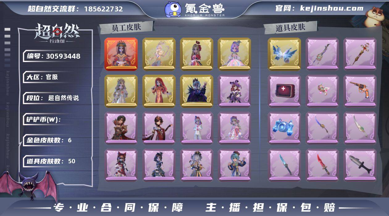 金色皮肤数量:6 紫色皮肤数量:28 道具皮肤数量:50 镜生遗梦 莲华渡,血色中的玛丽,遗失的童话,圣光之谕,镜花辞,渡鸦公爵 卖家说:超自然全皮号,头像框瑕缺原始股东,,道具皮全,头套瑕龙傲天,背饰全,挂饰全,历史段位传说1700,铲铲币近9000W,粉丝点赞30000加,氪条近7000