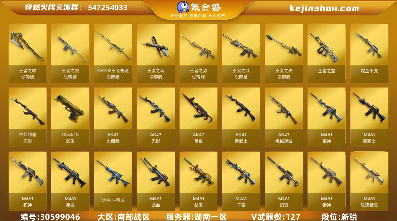 【FC-e5MLVJ】湖南一区,等级102,传说武器1,王者武器12,炫金武器1,V武器127, 【英雄角色】传说艾莉莎,传说星骇,王者炫,王者春,王者炽天使,王者玲珑,隼,兰-巾帼英雄,荒漠琉璃,月兔特工,晴雅,审判者,零,樱,影豹,葵,瞳,灵狐者-职业经理,王者涂鸦,王者葵-惊若翩鸿, 【传说武器】传说夜影, 【V武器】M200-幻神,M200-竞技荣光,Kar98K-星神,Barrett-毁灭,AWM-裁决,QBZ03-天罚,QBZ03-金色蔷薇,M4A1-幻灵,M4A1-神工天巧,加特林-炼狱,汤姆逊-烈龙,柯尔特-竞技荣光,USP-神工天巧,USP-冥王,COP 357-幻灵,Knife-冠军之刃,炽芒蝶刃,Barrett-极光,Barrett-朱雀,AWM-天龙,M4A1-雷神,M4A1-黑骑士,M4A1-黑龙,M4A1-千变,M4A1-猎神,M4A1-青龙,M4A1-玫瑰精灵,M4A1-武圣,M4A1-龙血,M4A1-死神,AK47-火麒麟,AK47-无影,AK47-黑鲨,AK47-黑武士,AK47-机械迷城,烈火-动感闪耀,AK12-天启,无影-神兵利器,机械迷城-穹宇,沙鹰-修罗,沙鹰-天神,天神-动感闪耀,Glock18-武圣,屠龙,丛林匕首-玄豹,麒麟刺,龙啸,擎天,擎天-竞技荣光,幻灵之锋,屠龙-动感闪耀,高爆手雷-幻灵,闪光弹-幻灵,烟雾弹-幻灵,高爆手雷-竞技荣光,闪光弹-竞技荣光,烟雾弹-竞技荣光,高爆手雷-神工天巧,闪光弹-神工天巧,烟雾弹-神工天巧,手雷-动感闪耀, 【王者武器】炼狱-悦蓝-觉醒版,王者之烈-觉醒版,王者之光-觉醒版,王者之霆,王者风神-觉醒版,王者之势-觉醒版,白虎之魄-觉醒版,王者之啸-觉醒版,王者之魂-觉醒版,王者之武-觉醒版,王者风神-觉醒版,QBZ-03-王者蔷薇-觉醒版, 【狙击枪稀有皮肤】幻神-CFS2022,幻神-冠军之幻,幻神-巅峰荣耀,幻神-动感闪耀 皮肤,M200-幻神-荣耀世冠白鲨,幻神-青鹤,星神-漫游,Kar98K-星神-冠军之星皮肤,裁决-运输船 皮肤,毁灭-荣耀之怒,毁灭...