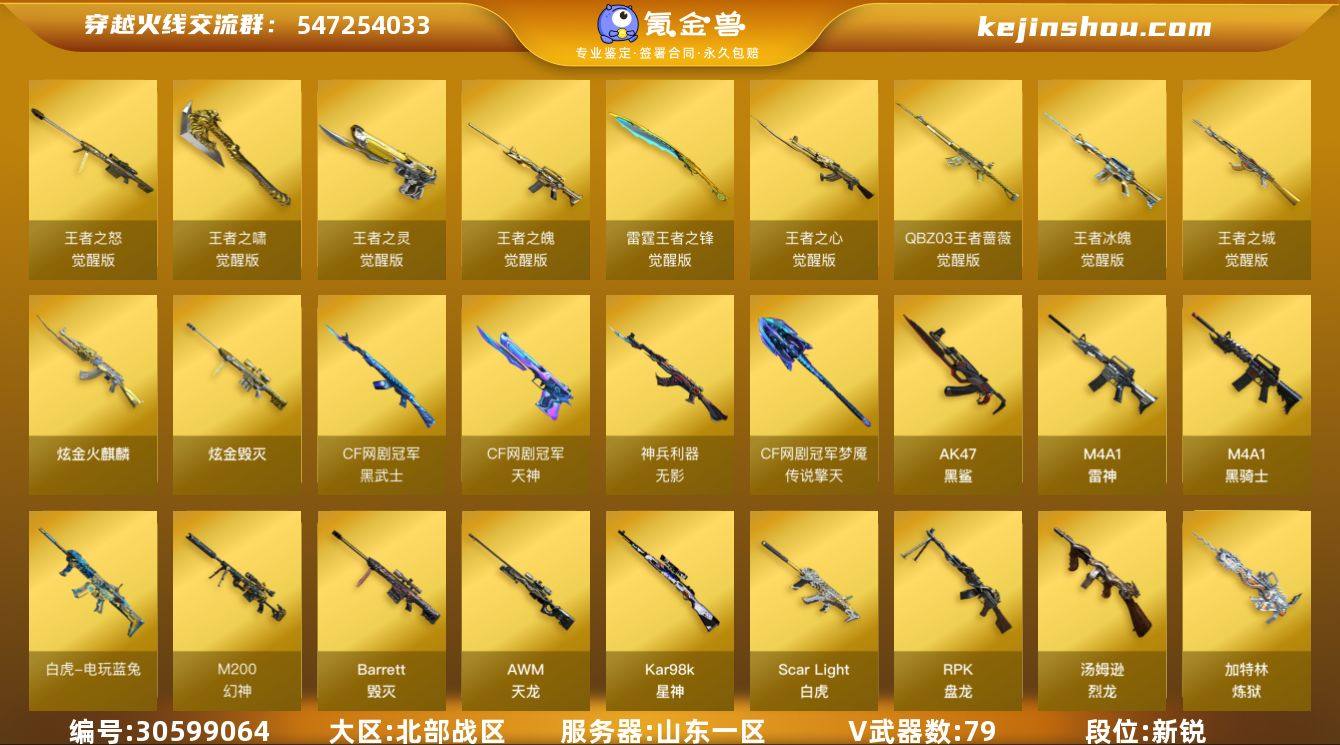 【FC-vWdSGk】山东一区,等级102,传说武器1,王者武器13,炫金武器3,V武器79, 【英雄角色】雅典娜,王者-葵-貂蝉,王者沙漠玫瑰,迷迭香,鹰,电竞教官-云悠悠,职业选手,灵狐者-黄金海岸,猎狐者,王者涂鸦, 【传说武器】传说光耀, 【V武器】M200-幻神,M200-竞技荣光,Kar98K-星神,Barrett-暗月传说,Barrett-毁灭,Scar Light-白虎,白虎-电玩蓝兔,RPK-盘龙,加特林-炼狱,汤姆逊-烈龙,柯尔特-竞技荣光,柯尔特-电竞装甲,USP-雷暴,AWM-天龙,M4A1-雷神,M4A1-黑骑士,AK47-黑鲨,黑武士-CF网剧冠军,无影-神兵利器,沙鹰-修罗,天神-CF网剧冠军,屠龙,麒麟刺,龙啸,擎天-竞技荣光,斩神刀-雷暴,擎天-CF网剧冠军,麒麟刺-百战金芒,高爆手雷-雷暴,闪光弹-雷暴,烟雾弹-雷暴,烟雾弹-电竞装甲,高爆手雷-竞技荣光,闪光弹-竞技荣光,烟雾弹-竞技荣光,恶棍-电竞装甲,M4A1-再燃火线,AK-47-猩红传说, 【王者武器】王者之心-觉醒版,王者之魄-觉醒版,王者之灵-觉醒版,王者之啸-觉醒版,王者冰魄-觉醒版,烟雾弹-雷霆王者-觉醒版,雷霆王者之锋-觉醒版,闪光弹-雷霆王者-觉醒版,王者之城-觉醒版,王者星神-觉醒版,王者之怒-觉醒版,QBZ-03-王者蔷薇-觉醒版, 【狙击枪稀有皮肤】幻神-CFS2022,幻神-AG-CFPLS17冠军,幻神-巅峰荣耀,毁灭-荣耀之怒,毁灭耀金皮肤,毁灭-神秘黑洞皮肤,毁灭-黑大圣皮肤,AWM-天龙-传奇70KG,AWM-天龙-传奇白鲨, 【步枪稀有皮肤】白虎-电玩粉兔皮肤,雷神-荣耀之魄,雷神-宠儿-2019MVP,雷神-宇航兔皮肤,雷神-星空,雷神-暗月,雷神-虎将,雷神-耀金皮肤,雷神-赛博朋克,火麒麟-轻羽皮肤,黑骑士-电玩青兔皮肤,黑骑士-暗月,黑骑士-摸金校尉,AK47-B-常胜将军-孙权,无影-能量核心,无影-霓裳皮肤, 【机枪稀有皮肤】炼狱-玩具枪皮肤, 【副武器稀有皮肤】修...