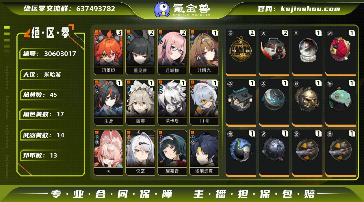 冒险等级:60 总黄数:45 菲林底片数量:8 菲林数量:447 加密母带数量:1 五星角色数:17 3命珂蕾妲,2命星见雅,2命月城柳,1命叶瞬光,1命朱鸢,1命丽娜,1命莱卡恩,1命「11号」,0命照,0命仪玄,0命耀嘉音,0命浅羽悠真,0命凯撒,0命青衣,0命艾莲,0命猫又,0命格莉丝 五星武器数:14 2精青溟笼舍,2精嵌合编译器,1精云霓孤光,1精玲珑妆匣,1精霰落星殿,1精时流贤者,1精奔袭獠牙,1精玉壶青冰,1精防暴者VI型,1精啜泣摇篮,1精硫磺石,1精钢铁肉垫,1精深海访客 邦布数量:13 5精格列佛探员,3精鲨牙布,1精罗宾,1精咔嚓仔,1精赤红莫库斯,1精阿崔巡查,1精巴特勒,1精飚速布,1精艾米莉安,1精阿全,1精插头布,1精左轮布,1精共鸣布 狡黠甜心,漪光夜曲
