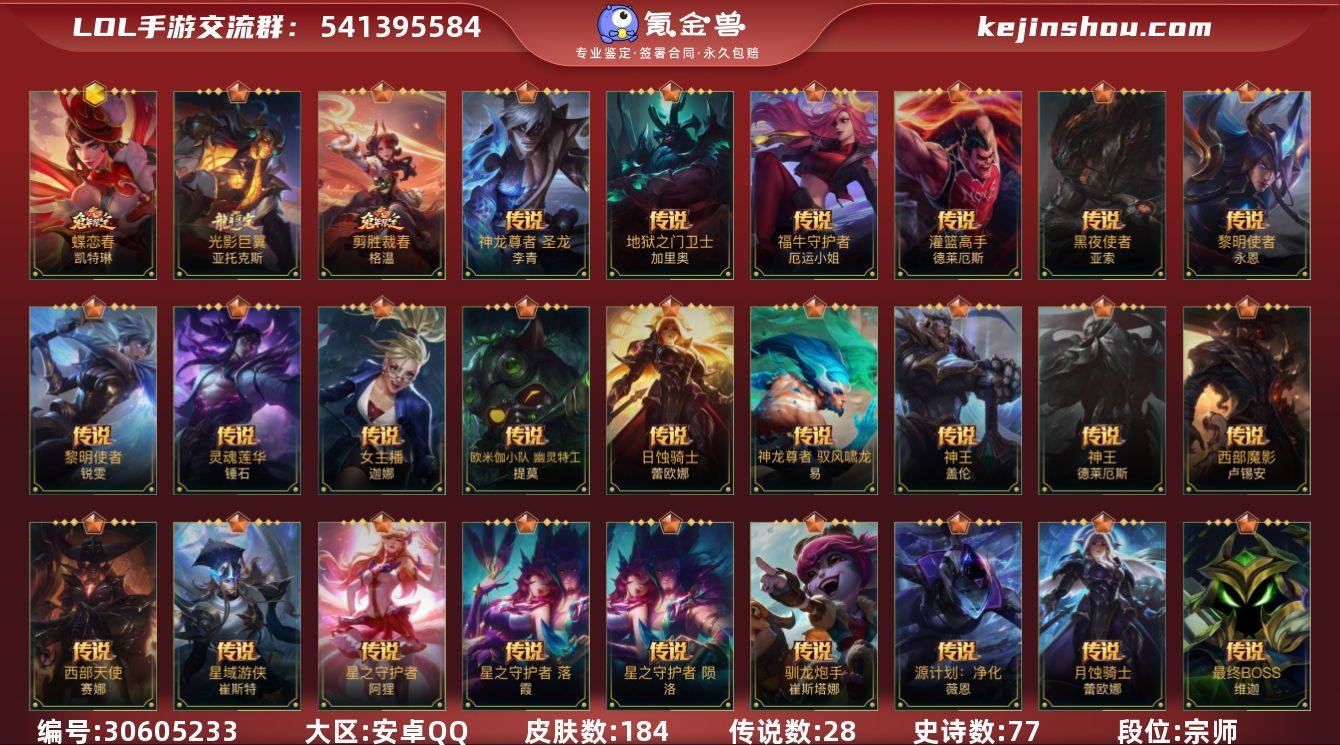 皮肤数:184 典藏皮肤数量:0 神话皮肤数量:1 传说皮肤数量:28 史诗皮肤数量:77 蝶恋春女警 段位:宗师