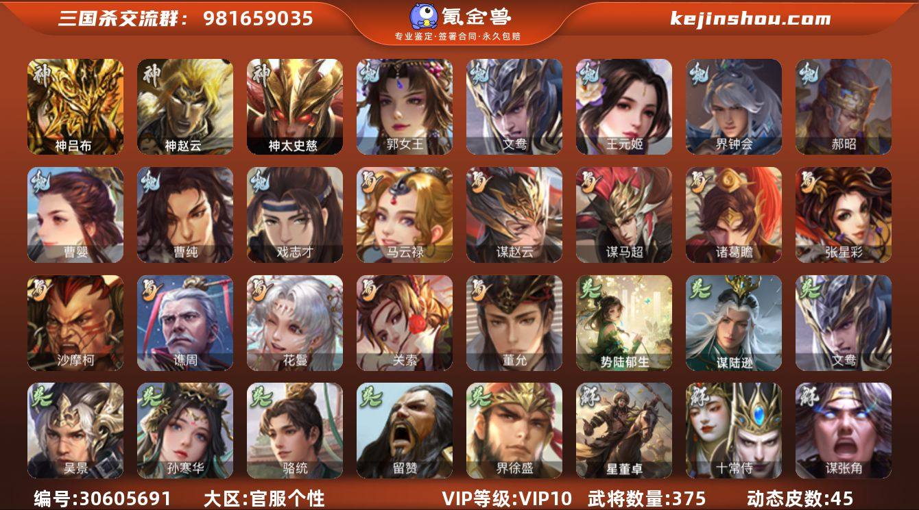 官阶:大将军;VIP等级:VIP10;史诗武将数量:44;动态皮肤数量:45;武将总数:375;史诗宝珠数量:12;将魂数量:4210;神将:5;魏国史诗武将:24;蜀国史诗武将:10;吴国史诗武将:7;群史诗武将:15