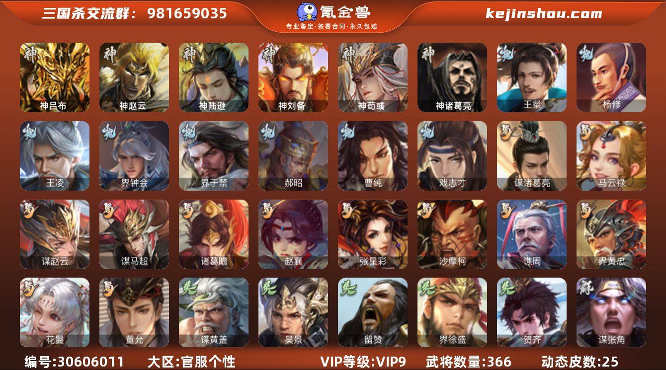 官阶:大将军;VIP等级:VIP9;史诗武将数量:43;动态皮肤数量:25;武将总数:366;史诗宝珠数量:3;将魂数量:4975;神将:8;魏国史诗武将:13;蜀国史诗武将:12;吴国史诗武将:5;群史诗武将:10 神吕布,神赵云,神陆逊,神刘备,神荀彧,神吕蒙,神周瑜,神诸葛亮,王粲,杨修,王凌,魏-司马昭,界钟会,界于禁,郝昭,曹纯,戏志才,谋诸葛亮,马云騄,谋赵云,谋马超,诸葛瞻,赵襄,张星彩,沙摩柯,谯周,界黄忠,花鬘,董允,谋黄盖,吴景,留赞,界徐盛,贺齐,左慈,张让,星黄忠,陶谦,麹义,沮授,界左慈,界李儒,杜预,谋张角,神陆逊-绽焰摧枯(动态),神吕蒙-兼资文武(动态),神诸葛亮-观星唤雨,神曹操-天下归心,神赵云-战龙在野(动态),SP蔡文姬-兔年冬日(动态),张春华-牛年立冬(动态),辛宪英-鼠年春节(动态),曹昂-竭战麟伤(动态),戏志才-举棋若定(动态),朱灵-以战破氐(动态),司马昭-昭威淮南(动态),诸葛亮-龙年限定(动态),马超-牛年春节(动态),马超-明良千古(动态),张飞-明良千古(动态),界马超-牛年春节(动态),关银屏-兔年春节(动态),张星彩-猪年中秋(动态),关索-虎年七夕(动态),卧龙诸葛-火烧博望(动态),周处-义除三害(动态),孙策-虎踞江东(动态),孙权-猪年端午(动态),孙尚香-星流霆击(动态),界孙权-猪年端午(动态),界孙尚香-星流霆击(动态),徐盛-破军杀将(动态),孙寒华-蛇年限定(动态),灵雎-霜刃绚练(动态),麹义-扬刀立威(动态),貂蝉-鼠年七夕(动态),吕布-鼠年七夕(动态),界吕布-鼠年七夕(动态),界貂蝉-鼠年七夕(动态)