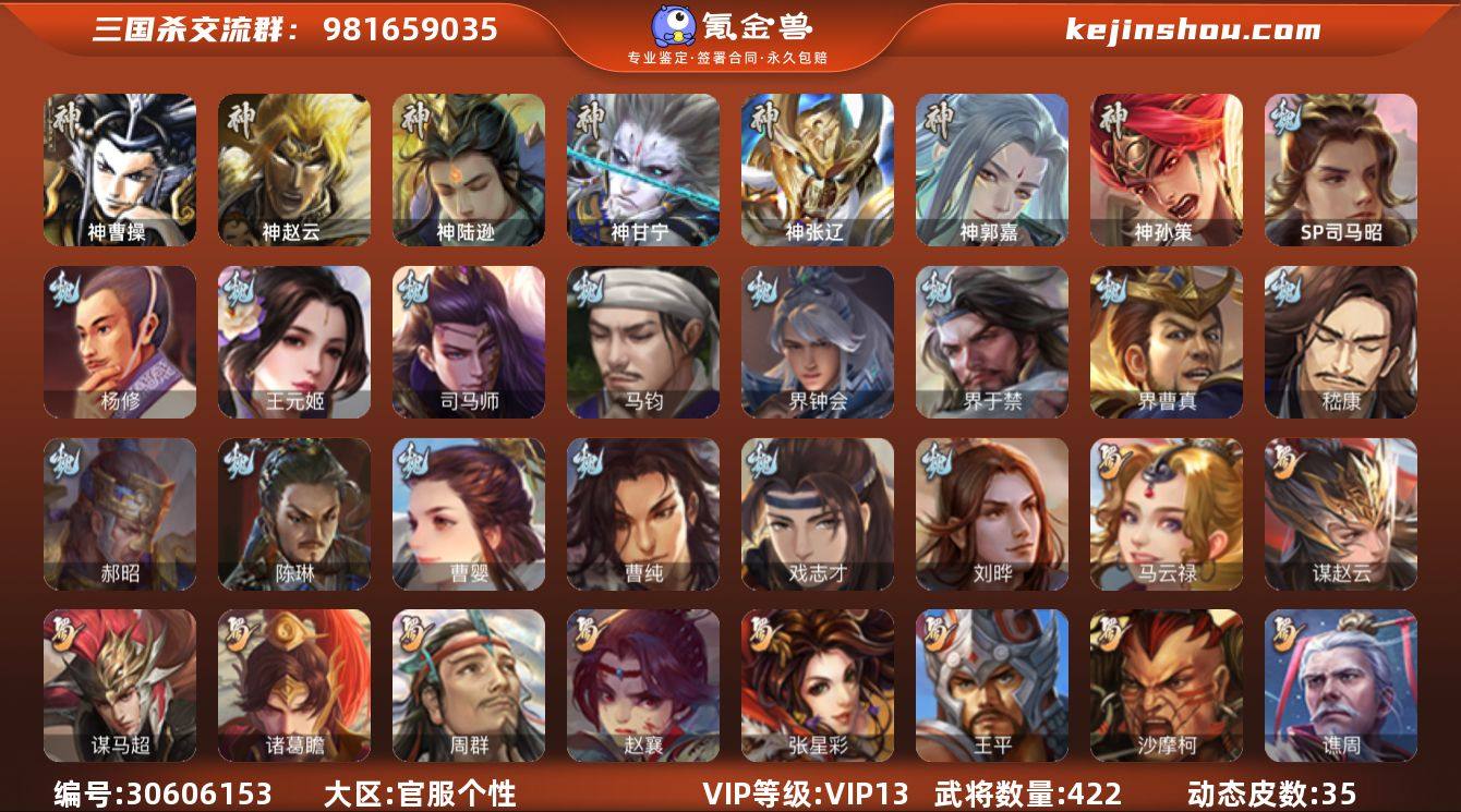 官阶:大将军;VIP等级:VIP13;史诗武将数量:66;动态皮肤数量:35;武将总数:422;史诗宝珠数量:0;将魂数量:1143;神将:10;魏国史诗武将:35;蜀国史诗武将:15;吴国史诗武将:7;群史诗武将:22 神曹操,神赵云,神陆逊,神甘宁,神张辽,神郭嘉,神孙策,神关羽,神吕蒙,神周瑜,SP司马昭,杨修,王元姬,司马师,马钧,界钟会,界于禁,界曹真,嵇康,郝昭,陈琳,曹婴,曹纯,戏志才,刘晔,关索,马云騄,谋赵云,谋马超,诸葛瞻,周群,赵襄,张星彩,王平,沙摩柯,谯周,界黄忠,花鬘,董允,鲍三娘,吴景,孙皓,骆统,留赞,界朱然,界徐盛,贺齐,左慈,张仲景,张让,张琪瑛,徐荣,王允,陶谦,苏飞,司马徽,麹义,南华老仙,祢衡,刘璋,刘焉,沮授,界左慈,界李儒,公孙康,杜预,张绣,李傕,许攸,神郭嘉-虎年清明(动态),神甘宁-万人辟易(动态),神陆逊-绽焰摧枯(动态),神诸葛亮-风舞魔鸟(动态),神周瑜-焰腾麒麟(动态),神诸葛亮-观星唤雨,神曹操-天下归心,神曹操-玄天通冥(动态),神赵云-战龙在野(动态),鲍三娘-情定缘起,星周不疑-龙年清明(动态),许褚-虎啸生风(动态),司马懿-牛年立冬(动态),甄姬-洛水神韵(动态),郭嘉-十胜十败(动态),邓艾-神兵天降(动态),界司马懿-牛年立冬(动态),界许褚-虎啸生风(动态),界郭嘉-十胜十败(动态),界甄姬-洛水神韵(动态),界邓艾-神兵天降(动态),于禁-威严毅重(动态),张春华-牛年立冬(动态),曹真-虎年春节(动态),界于禁-威严毅重(动态),朱灵-以战破氐(动态),曹纯-虎年春节(动态),曹纯-长坂败备(动态),司马师-牛年中秋(动态),诸葛亮-龙年限定(动态),马超-牛年春节(动态),张飞-据水断桥(动态),界张飞-据水断桥(动态),界马超-牛年春节(动态),夏侯氏-明良千古(动态),孙策-兔年清明(动态),孙权-牛年七夕(动态),小乔-猪年大雪(动态),界孙权-牛年七夕(动态),界小乔-猪年大雪(动态),徐氏-琪花瑶草(动态),孙茹-烟水悠悠(动态),吕布-鼠年七夕(动态),...