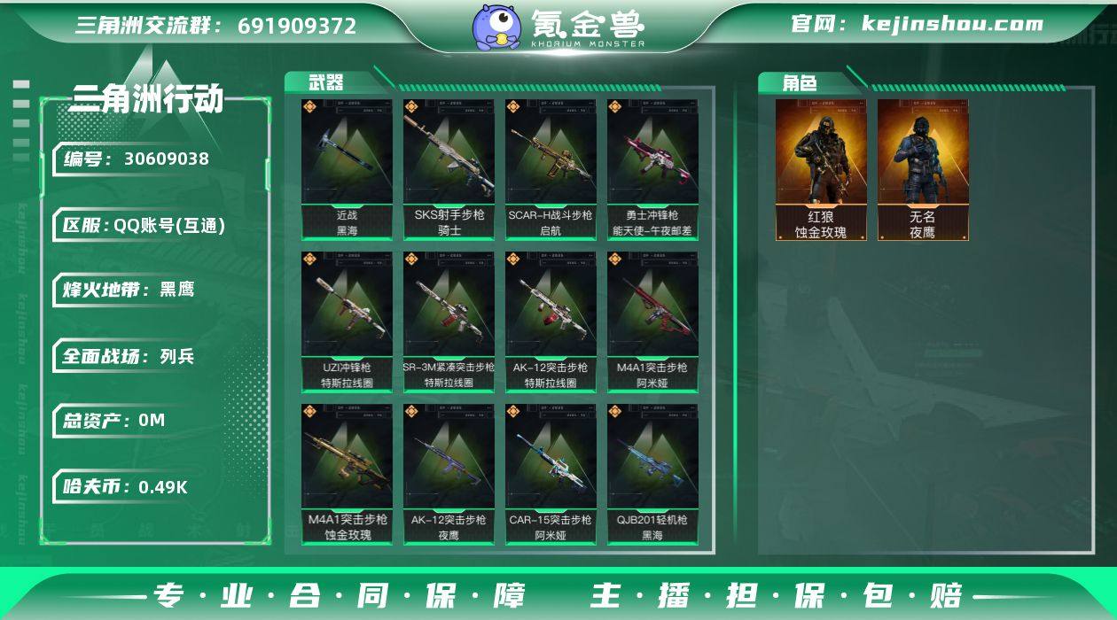 【SJZ018】实名: 不可修改 烽火地带段位: 黑鹰 全面战场段位: 列兵 总资产: 271 哈夫币: 498 传说武器皮肤: M4A1突击步枪-蚀金玫瑰,QJB201轻机枪-黑海,MP5冲锋枪-黑海,近战-黑海,AK-12突击步枪-夜鹰,SMG45冲锋枪-骑士,M4A1突击步枪-阿米娅,CAR-15突击步枪-阿米娅,AK-12突击步枪-特斯拉线圈,SR-3M紧凑突击步枪-特斯拉线圈,UZI冲锋枪-特斯拉线圈,勇士冲锋枪-能天使-午夜邮差,SCAR-H战斗步枪-启航,SKS射手步枪-骑士 史诗武器皮肤: SVD狙击步枪-阿萨拉工艺,Vector冲锋枪-阿萨拉文明,S12K霰弹枪-曙光,沙漠之鹰-曙光,M700狙击步枪-蝮蛇,PKM通用机枪-蝮蛇,SR-3M紧凑突击步枪-英雄,PKM通用机枪-英雄,AKM突击步枪-林中猎手,SG552突击步枪-深海恐惧,勇士冲锋枪-深海恐惧,MP5冲锋枪-深海恐惧,SR-25射手步枪-尖端治疗,Ash-12战斗步枪-守夜人,SG552突击步枪-尖端治疗,M700狙击步枪-守夜人,AS Val突击步枪-尖端治疗,PKM通用机枪-守夜人,M1014霰弹枪-林中猎手,SV-98狙击步枪-林中猎手,AS Val突击步枪-典狱官,SCAR-H战斗步枪-囚徒,M16A4突击步枪-竞赛选手,QJB201轻机枪-Old Habits,勇士冲锋枪-工业狂潮,SR-3M紧凑突击步枪-战术竞备,M250通用机枪-寒冬猎手,MP5冲锋枪-竞技风,K416突击步枪-冬日风情,AUG突击步枪-紧急戒备 干员外观: 红狼-蚀金玫瑰,无名-夜鹰(S4) 载具皮肤: 突击直升机-飓风行动,步战车-无瑕,步战车-凝视,轮式突击炮-暗夜行动,侦察直升机-凝视,突击直升机-暗夜行动,轮式突击炮-凝视