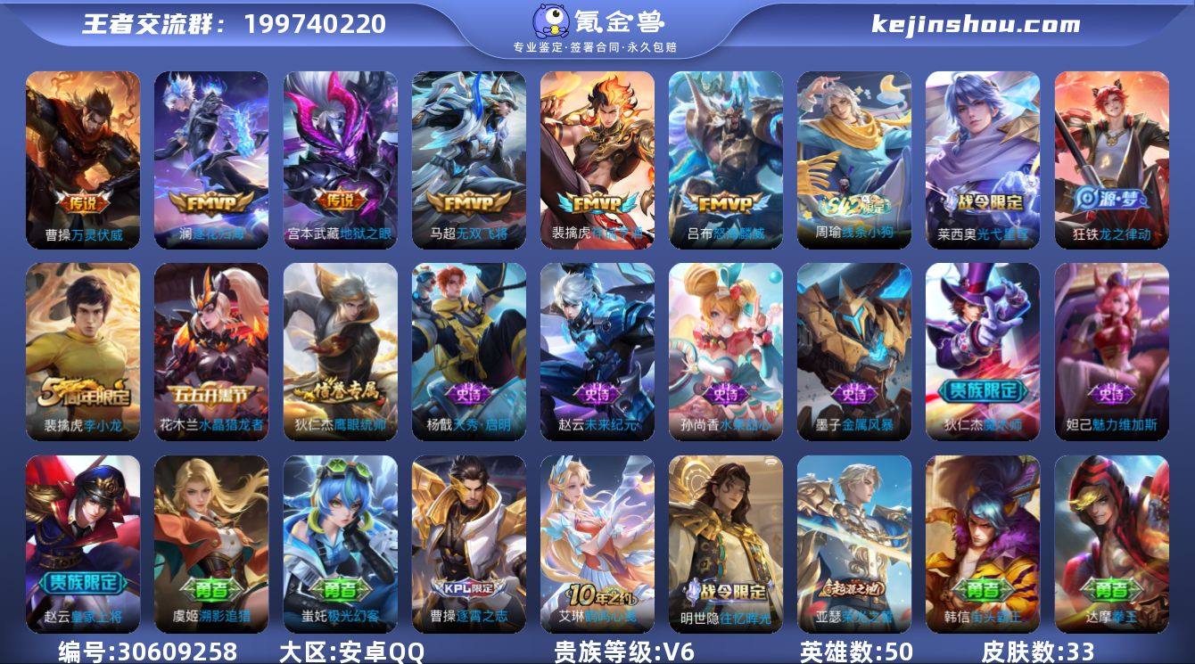 不可二次-安卓Q-V6-至尊星耀IV段位-48英雄-32皮肤-6传说-12史诗QW2611416 【传说皮肤】:曹操万灵伏威,裴擒虎祥瑞亨通,澜逐花归海,吕布怒海麟威,马超无双飞将,宫本武藏地狱之眼 【限定皮肤】:赵云皇家上将,狄仁杰魔术师,项羽海滩派对,裴擒虎李小龙 【史诗皮肤】:赵云皇家上将,赵云未来纪元,狄仁杰魔术师,孙尚香水果甜心,妲己魅力维加斯,墨子金属风暴,花木兰水晶猎龙者,狄仁杰鹰眼统帅,裴擒虎李小龙,杨戬天秀启明,狂铁龙之律动,莱西奥光弋星穹,周瑜线条小狗 【其他皮肤】:项羽海滩派对,韩信街头霸王,亚瑟死亡骑士,达摩拳王,张良缤纷绘卷,赵怀真太极少年,亚瑟荣光之誓,明世隐往忆晖光,艾琳鹤鸣心笺,曹操逐霄之志,蚩奼极光幻客,虞姬溯影追猎,元歌午夜歌剧院 【营地ID】:1593811694