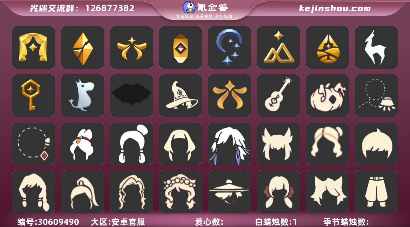 安卓官服 手机账号 1珍稀物品 9毕业季 2毕业图 675蜡烛 【珍稀物品】白枭(帝企鹅发) 【季节已毕业】迁徙季,青鸟季,双星季,表演季,九色鹿(九色鹿季),筑巢季,二重奏季,姆明季,彩染季 【完成地图】霞谷,墓土(暮土) 【礼包】青衫落拓礼包,线框斗篷礼包(周年线框斗篷),爱丽丝围裙套装礼包,向日葵连衣裙(连衣裙),兔子鞋(兔子拖鞋),姆明饰品套装(姆明尾巴),海蓝波浪发型(海洋发型),巫师(巫师帽),绊爱(绊爱斗篷)(绊爱礼包),橘子(大橘大利),兔子(玉兔头饰)(玉兔发饰)(兔子发饰),四叶草(四叶草头饰),星月头饰(星月头冠),九色鹿角(神鹿祝福头饰)(神鹿祝福礼包),新年耳钉(金鳞耳饰),彩虹耳机,鹿角(圣诞鹿角),围巾(小王子斗篷)(小王子围巾),欧若拉之翼,蝙蝠套(蝙蝠斗篷)(南瓜头),蜘蛛斗(蛛丝斗篷)(蛛网斗篷),猫套(皮皮猫斗)(皮皮猫礼包),吉他(音韵吉他)(白吉他),红伞(瑞气纸伞),献瑞折扇礼包,猫背饰(猫咪背饰),大铁头,小狗周年发饰(小狗周年头饰) 【裤子】筑巢季·裤子(设计师长袍),青鸟尊贵蓬头裤子(蓝色燕尾服),飞天裤(柔缎花边连)(九色鹿丝带裤),妮妮裙子(妮妮长裙),武士裤,搓澡巾,击剑裤 【面具】黄眉企鹅面具,辉光羚羊面具 【面饰】青鸟毕业面饰(青鸟面饰),红耳机 【发型】海蓝波浪发型,飞天盘发(九色鹿丸子头),留辫蘑菇头,虚荣 【头饰】平顶帽,蓝色音乐会(蓝色音乐符) 【斗篷】燕尾斗篷,青鸟毕业斗篷(青鸟斗篷),彩染围巾斗篷,绿芽,海洋斗 【配饰】小红伞(姆明红伞)(姆明大伞),姆明抱枕,二重奏挂画(合奏挂画),雨伞,筑巢季·小手办(光之子试衣),高音钢琴(白色高脚钢琴)