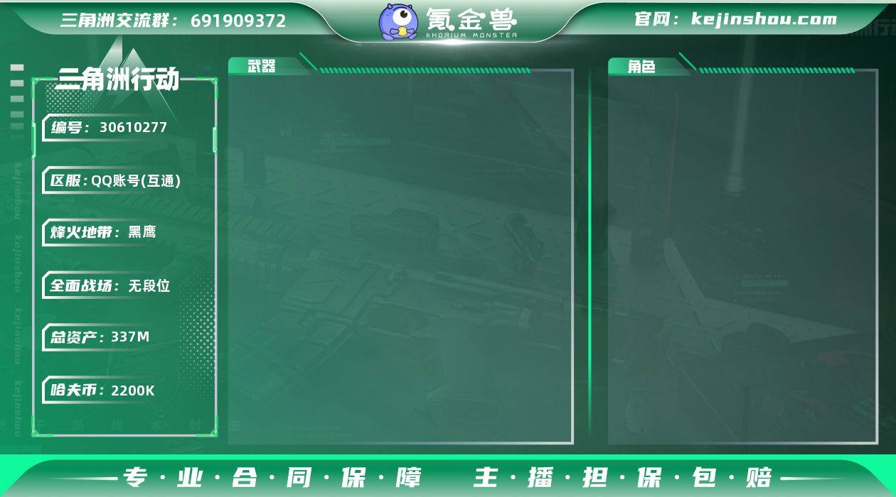 总资产:337M 哈夫币:2200K 烽火地带等级:60 烽火地带段位:黑鹰 全面战场等级:1 全面战场段位:无段位 卖家说:里面撞车的东西都有七八百块钱