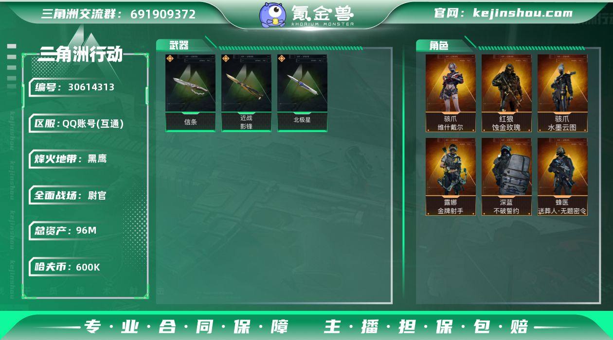 总资产:96M 哈夫币:600K 烽火地带等级:60 烽火地带段位:黑鹰 全面战场等级:50 全面战场段位:尉官 骇爪-维什戴尔,红狼-蚀金玫瑰,骇爪-水墨云图 露娜-金牌射手,深蓝-不破誓约,蜂医-送葬人·无题密令 信条,影锋,北极星