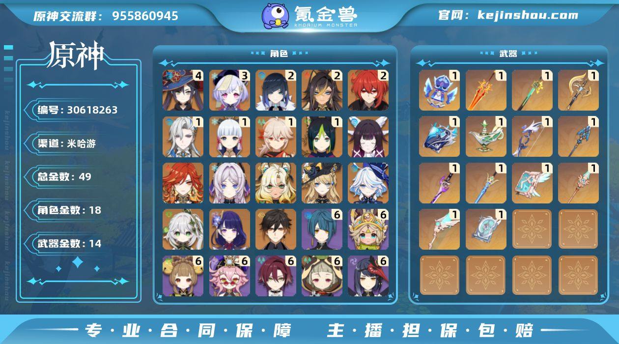 冒险等级:60 总黄数:49 5星角色数:18 5星武器数:14 原石数量:111910 纠缠之源数量:4 4命莫娜,3命七七,2命夜兰,2命迪希雅,2命迪卢克,1命那维莱特,1命神里绫华,1命枫原万叶,1命提纳里,0命哥伦比娅,0命玛薇卡,0命茜特菈莉,0命希诺宁,0命娜维娅,0命芙宁娜,0命纳西妲,0命雷电将军,0命钟离 6命卡齐娜,6命行秋,6命芭芭拉,6命北斗,6命多莉,6命菲谢尔,6命九条裟罗,6命鹿野院平藏,6命诺艾尔,6命凝光,6命瑶瑶,6命早柚,5命班尼特,5命久岐忍,5命柯莱,5命罗莎莉亚,5命五郎,4命香菱,3命嘉明,3命欧洛伦,3命绮良良,3命迪奥娜,2命琳妮特,2命伊安珊,2命坎蒂丝,2命米卡,2命砂糖,1命菲米尼,1命夏沃蕾,1命伊法,1命重云,1命凯亚,1命雷泽,1命托马,1命烟绯,0命爱诺,0命蓝砚,0命赛索斯,0命夏洛蒂,0命安柏,0命珐露珊,0命卡维,0命丽莎,0命莱依拉,0命辛焱,0命云堇 精1祭星者之望,精1焚曜千阳,精1岩峰巡歌,精1裁断,精1万世流涌大典,精1千夜浮梦,精1若水,精1息灾,精1雾切之回光,精1苍古自由之誓,精1天空之卷,精1天空之脊,精1天空之翼,精1四风原典 100%侦察骑士,帆影游风,花时来信,倩影游侠,岁夜欢哗,星与月之约,雨化竹身,叶隐芳名,致教会自由人 卖家说:月神哥伦比娅,共811抽,原石12万,创世结晶2250,粉球21,蓝球12,树脂280+,10个648也就500抽,性价比拉满。火神队+龙王队,带专武,绫华+夜兰服装,队伍圣遗物大毕业,地图资源还多,探索度须弥60%,枫丹50%,纳塔50%,沉玉谷等新地图探索度不高,邮箱因自己要用,无法修改,购买后可配合修改密码等信息,本人承诺绝不找回。