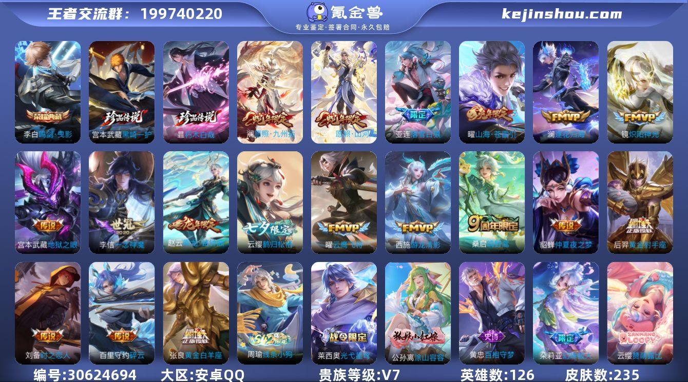 安卓Q-V7-永恒钻石I段位-126英雄-235皮肤-1典藏皮肤-2珍品传说-19传说-67史诗 【英雄全皮】:赵怀真全皮,影全皮 【荣耀典藏】:李白鸣剑曳影 【珍品传说】:暃朽木白哉,宫本武藏黑崎一护 【传说皮肤】:后羿神树通天,司空震愿照山河定,澜愿照九州拓,桑启鸣野蒿,亚连落雪白狼,赵云乘龙铭钟鼎,澜逐花归海,云缨鹤归松栖,曜山海苍雷引,百里守约碎云,西施游龙清影,镜炽阳神光,曜云鹰飞将,李信一念神魔,刘备时之恋人,张良黄金白羊座,后羿黄金射手座,貂蝉仲夏夜之梦,宫本武藏地狱之眼 【限定皮肤】:蔡文姬夏日便利店,大乔绒语心约,虞姬夏日便利店,姜子牙天穹之誓,狄仁杰阴阳师,赵云皇家上将,元歌云间偶戏,马可波罗暗影游猎,狄仁杰魔术师,项羽海滩派对,孙悟空至尊宝,鬼谷子五谷丰年,裴擒虎李小龙,裴擒虎擒涛扼浪,米莱狄胡桃异想国,盾山梦圆繁星,嫦娥拒霜思,曜山海苍雷引,西施玲珑珍味,鲁班大师探海日志,镜匿光追影者,桑启海盐诗旅,赵怀真鹤归松栖,云缨鹤归松栖,阿古朵江河有灵,张良古海寻踪,蒙犽百解令,鬼谷子天穹祈灯,姬小满妄想食味,赵云乘龙铭钟鼎,亚连落雪白狼,沈梦溪龙舞盛年,刘邦剑破天穹,周瑜熔金海岸 【年限皮肤】:曜山海苍雷引,赵云乘龙铭钟鼎 【赛季限定】:张良古海寻踪,裴擒虎擒涛扼浪,鲁班大师探海日志,桑启海盐诗旅,鬼谷子天穹祈灯,刘邦剑破天穹,姜子牙天穹之誓 【战令限定】:蔡文姬夏日便利店,虞姬夏日便利店,元歌云间偶戏,马可波罗暗影游猎,米莱狄胡桃异想国,西施玲珑珍味 【史诗皮肤】:项羽苍穹之光,露娜紫霞仙子,阿轲暗夜猫娘,赵云皇家上将,赵云未来纪元,甄姬冰雪圆舞曲,狄仁杰魔术师,廉颇地狱岩魂,宫本武藏鬼剑武藏,孙尚香水果甜心,嬴政暗夜贵公子,嬴政摇滚巨星,妲己魅力维加斯,妲己女仆咖啡,墨子金属风暴,吕布...