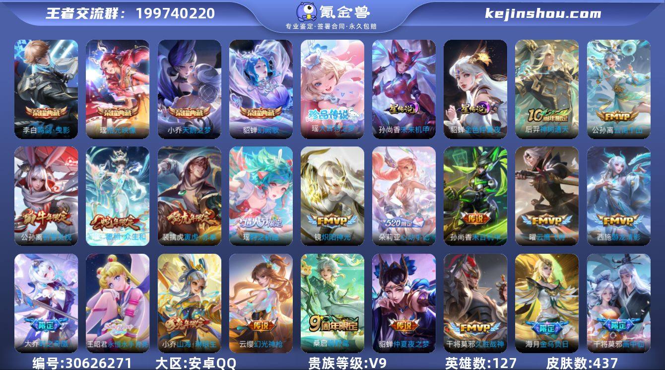 贵族等级:V9 典藏皮肤数:4 珍品无双皮肤数:0 无双皮肤数:0 珍品传说皮肤数:1 传说皮肤数:29 史诗皮肤数:142 皮肤数:437 英雄数:127 段位:钻石 卖家说:QQ连着好几个游戏,所以最低2700