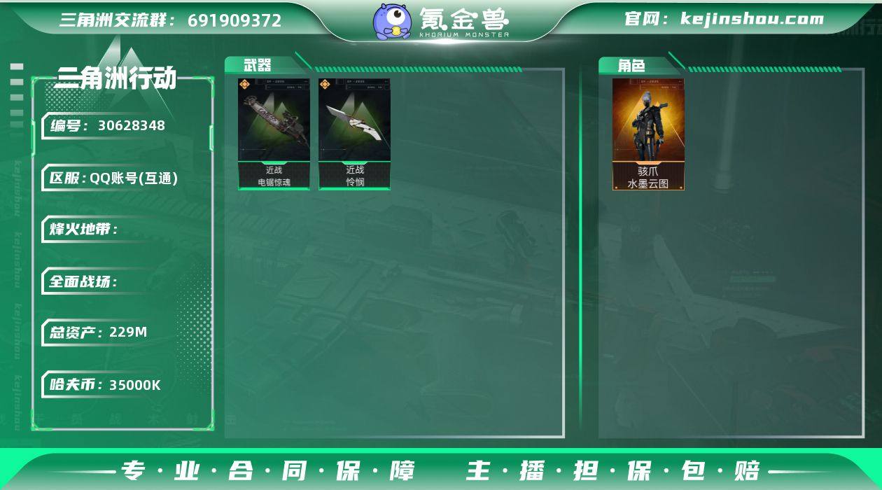 总资产:229M 哈夫币:35000K 烽火地带等级:60 全面战场等级:36 骇爪-水墨云图 电锯惊魂,怜悯 卖家说:号上还有74000三角券和4000三角币