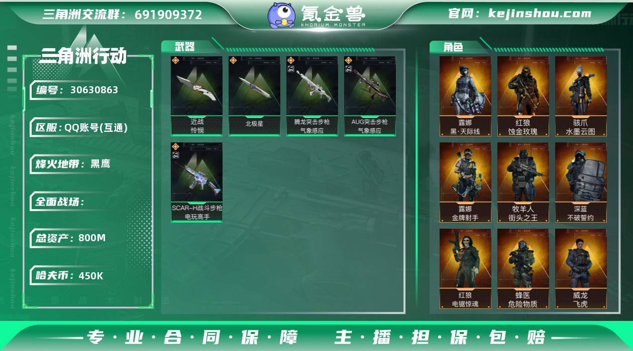 实名:可二次实名 总资产:800M 哈夫币:450K S7顶级安全箱(3x3) 烽火地带段位:黑鹰 烽火地带等级:60 全面战场等级:10