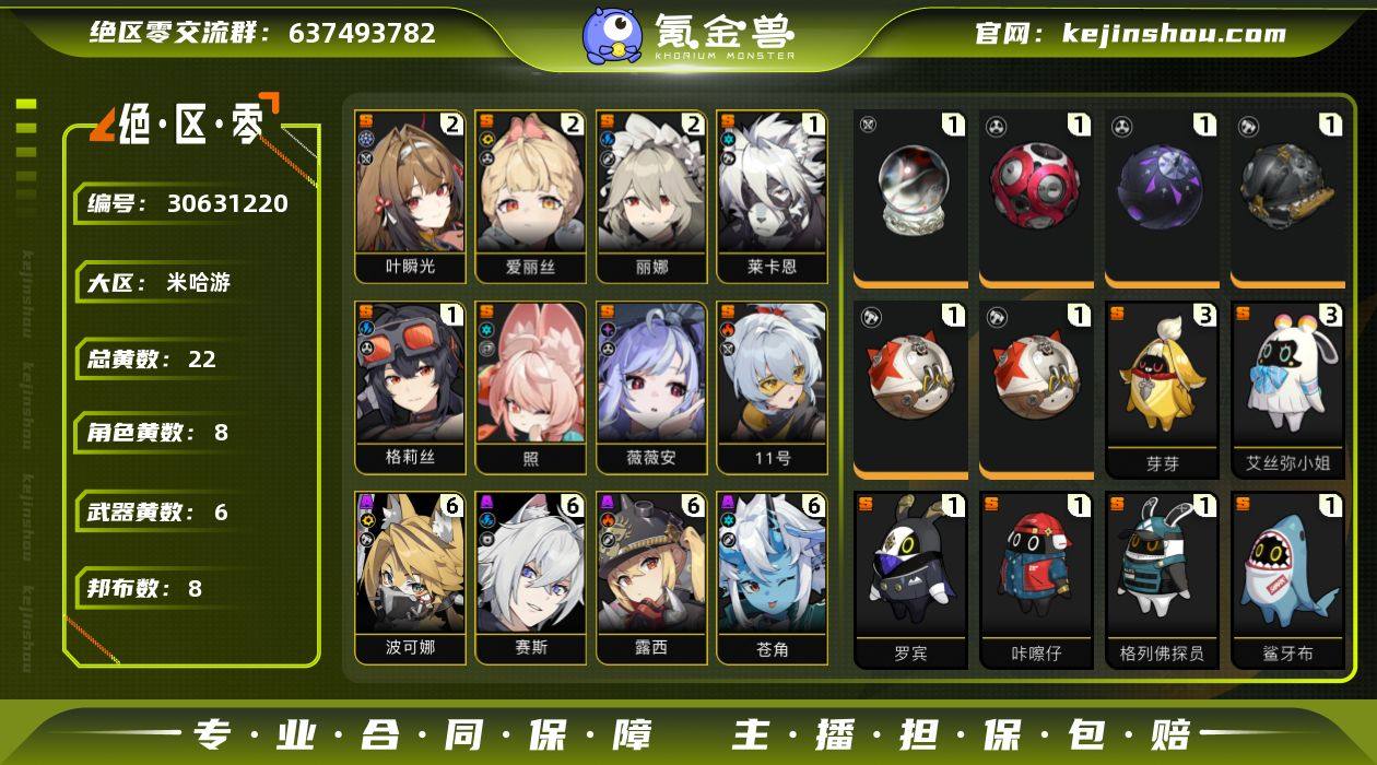 冒险等级:57 总黄数:22 菲林底片数量:0 菲林数量:397 加密母带数量:4 五星角色数:8 2命叶瞬光,2命爱丽丝,2命丽娜,1命莱卡恩,1命格莉丝,0命照,0命薇薇安,0命「11号」 五星武器数:6 1精云霓孤光,1精十方锻星,1精飞鸟星梦,1精拘缚者,1精燃狱齿轮 邦布数量:8 3精芽芽,3精艾丝弥小姐,1精罗宾,1精咔嚓仔,1精格列佛探员,1精鲨牙布,1精巴特勒,1精左轮布 百里香之海,白心旧影,晴澜双迹套装,漪光夜曲 卖家说:2➕1叶瞬光.2➕1爱丽丝 01薇薇安