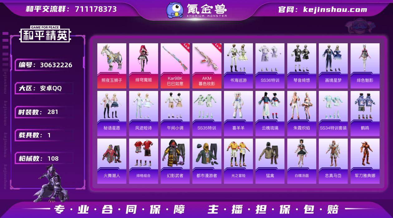 热力值:33087 载具数:1 时装数:281 枪械数:108 战备数:82 游戏等级:51 卓越印记:1 传奇印记:0 绝世印记:0 绯穹魔姬 五级Kar98K-巳巳如意,三级AKM-暮色玫影 照夜玉狮子 暮色玫影降落伞,极意拳锋飞行器,炫彩糖果降落伞,炫彩糖果飞行器,魔童闹海 哪吒降落伞,喜羊羊与灰太狼降落伞,鬼刀降落伞,环太平洋降落伞,龙行天下降落伞,莲影清波降落伞,熔岩统帅降落伞,炫光之旅降落伞 画境星梦,琴音绮想,书海巡游,SS36特训,炫彩糖果,绯色魅影,风迹短诗,秘语星愿,SS35特训,午间小调,喜羊羊,云魄琉璃,SS34特训套装,朱霞炽焰,北国孤狼,滨海厨神,白糯汤圆,贝斯之夜,春光漫游,长空猛禽,晨曦薄雾,都市漫游者,绯格组合,疯狂小兔子,福星高照,光之冒险,鹤鸣,幻世战舞者,火舞潮人,幻影武者,军刀雅典娜,酒红色名流,惊鸿侠骨,竞技达人朋克,竞技角斗士,竞技名士,竞技勇士朋克,锦衣飞扬,空岛之星,快闪甜心,龙的传人,猛禽,魅力单车,霓虹街区,破蛋小黄鸡,破晓战魂,帅气教官,SS19特训,SS20特训,SS21特训,SS25特训,SS26特训,SS29特训,SS30特训套装,SS31特训套装,SS33特训套装,甜蜜告白,无烬之地,完美偶像,无暇誓言,夏日音浪,香桃花海,星途旅人,耀粉歌者,云霞荷露,英勇保护者,鱼渊荷华,忠猛周仓,灼焰舞者,忠义严颜,忠真马岱 ACE32-冰晶雪宝,撬棍-暮色玫影,AA12-G-画境星梦,ACE32-画境星梦,M1加兰德-画境星梦,MK12-乌木金纹,MP5K-画境星梦,平底锅-画境星梦,AUG-冰晶雪宝,铝热弹-炫彩糖果,UZI-炫彩糖果,DBS-风迹短诗,蜜獾-风迹短诗,MK12-风迹短诗,Mk47-风迹短诗,莫辛纳甘-风迹短诗,F57-魔童闹海 敖闰,破片手榴弹-火尖莲影,撬棍-火尖枪,燃点复合弓-火尖莲影,AMR-喜羊羊与灰太狼,爆炸猎弓-喜羊羊与灰太狼,MG-36-薄荷星砂,AC-VAL-彩装战姬,AC-VAL-快闪甜心,AC-VAL-闲梦青缨,AKM-环太平洋,AKM-龙的传人,AKM-破晓战魂,AMR-鬼刀,ARX-凌霄紫焰,AUG-天降萌叽,AUG-耀粉歌者,爆炸猎弓-惊鸿侠骨,DBS-彩虹符号,大砍刀-青龙偃月刀,DP-28-彩虹符号,JS9-凌霄紫焰,Kar98K-彩虹符号,M16A4-幻世战舞者,M16A4-莲影清波,M200-惊鸿侠骨,M200-乌木金纹,M249-彩虹符号,M249-莲影清波,M249-破晓战魂,M416-红色方程式,M416-蓝色火焰,M416-糯团青竹,M417-惊鸿侠骨,M417-时空协奏,M762-天降萌叽,MG-36-凌霄紫焰,MG3-第五大道,MG3-幻世战舞者,MG3-惊鸿侠骨,蜜獾-天降萌叽,Mini14-涂山之恋,Mini14-香桃花海,MK20-H-快闪甜心,MK20-H-莲影清波,P18C-熔岩统帅,P90-快闪甜心,P92-凌霄紫焰,平底锅-惊鸿侠骨,平底锅-快闪甜心,撬棍-环太平洋,撬棍-龙胆亮银枪,S12K-破晓战魂,S686-彩虹符号,S686-红色方程式,SCAR-L-红色方程式,SCAR-L-炫彩节奏,SCAR-L-玉兔迎春,SKS-炫彩节奏,沙漠之鹰-快闪甜心,SPAS-12-狂鲨锋刃,SPAS-12-燕燕于飞,汤姆逊-环太平洋,汤姆逊-天降萌叽,汤姆逊-耀粉歌者,汤姆逊-樱桃泡泡,UMP45-蓝色火焰,UZI-红色方程式,UZI-天降萌叽,Vector-彩虹符号,Vector-龙行天下,Vector-燕燕于飞,VSS-