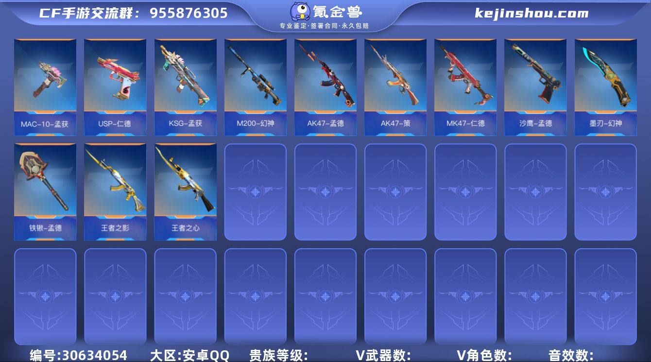 ABC9550/安卓QQ/钱包注销/可转区/可二次/261V/55角色/374万化/贵族7/王者武器13/孟德套/幻神套/仁德套/策套/孟获套/仲康套/王者之心/王者之影/王者之尊/王者之誉在王者之神/冰霜奇迹/王者之狱/王者之蝶/M12S雷霆王者/王者之魂/雷霆王者之锋/王者之击/81式光明之神三足金乌/【角色】/葵/幽灵刀锋/零/审判者/宋雨琦/刀锋枪战王者/黑武士套/毁灭套/无影套/冰锋套/波塞冬套/火力竞放套/机械迷城套/霸王龙套/诗仙套/天神套/炎龙侠套/鼓龙套/