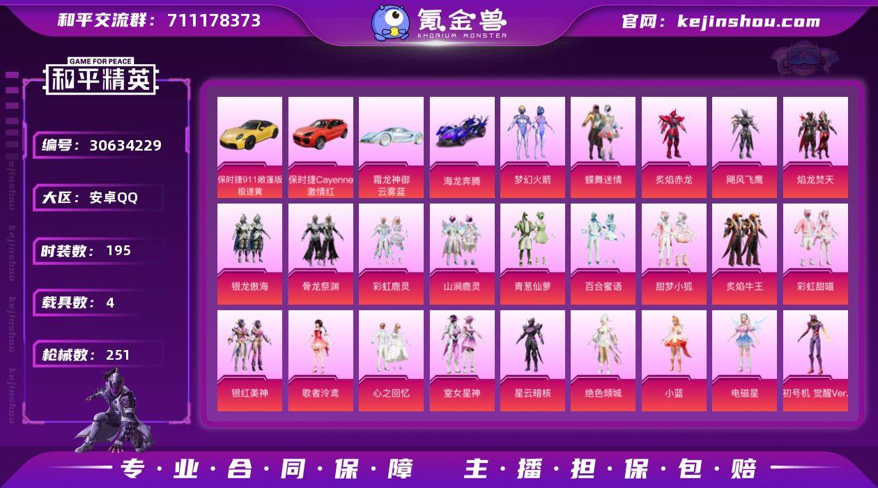 【特价出售/店主推荐】安卓 手Q-25粉装-3特效枪-4载具-8粉色飞行器-85497热力值-17王牌印记-195套装-251枪皮 【热门品类】:粉装-梦幻火箭,套装-龟仙人,套装-粉红小猪,角色-8号机 【粉色套装】:粉装-蝶舞迷情,粉装-梦幻火箭,粉装-炙焰赤龙,粉装-飓风飞鹰,粉装-焰龙焚天,粉装-银龙傲海,粉装-骨龙祭渊,粉装-彩虹鹿灵,粉装-山涧鹿灵,粉装-青葱仙萝,粉装-百合蜜语,粉装-甜梦小狐,粉装-炙焰牛王,粉装-彩虹甜喵,粉装-银红美神,角色-歌者泠鸢,粉装-心之回忆,粉装-室女星神,角色-星云暗核,角色-绝色倾城,角色-小蓝,角色-电磁星,角色-初号机 觉醒Ver.,粉装-星月云朵,角色-冷漠罗丽 【粉色枪皮等级】:AKM-百合蜜语(七级),Kar98K-巳巳如意(五级),DP-28-豹影疾电(五级) 【粉色载具】:霜龙神御(云雾蓝),保时捷911 敞篷版(极速黄),保时捷Cayenne(激情红),海龙奔腾,僚机-萌兔起飞 【粉色枪皮】:AKM-百合蜜语,Kar98K-巳巳如意,DP-28-豹影疾电 【粉色飞行器】:绮梦青鸾飞行器,歌者泠鸢飞行器,萌物绒绒飞行器,花傲天飞行器,圣域金龙飞行器,终晖之翼飞行器,极意拳锋飞行器 【粉色降落伞】:梦幻火箭降落伞,怪笑疯兔降落伞,焰龙焚天降落伞,林间仙鹿降落伞,甜梦小狐降落伞,炙焰牛王降落伞,彩虹甜喵降落伞,歌者泠鸢降落伞,闲梦青缨降落伞,星空武士降落伞,精灵梦叶罗丽降落伞,初号机 觉醒Ver.降落伞,金丰海韵降落伞,桃粉嫣然降落伞,圣域龙灵降落伞,冷漠罗丽降落伞,荧海星豚降落伞,炫彩糖果降落伞 【稀有套装】:套装-龟仙人,套装-巳巳如意,套装-雏菊兔兔,套装-萝兰蝴蝶,套装-小熊娃娃,套装-闪电轻猫,套装-雪夜云雾,套装-粉恋花,套装-紫幽梦,套装-蓝冰羽,套装-星影赞美诗,套装-彩虹兔,套装-云朵鹅,套装-雪绒豹,角色-乐音,套装-炫彩糖果 【稀有枪皮】...