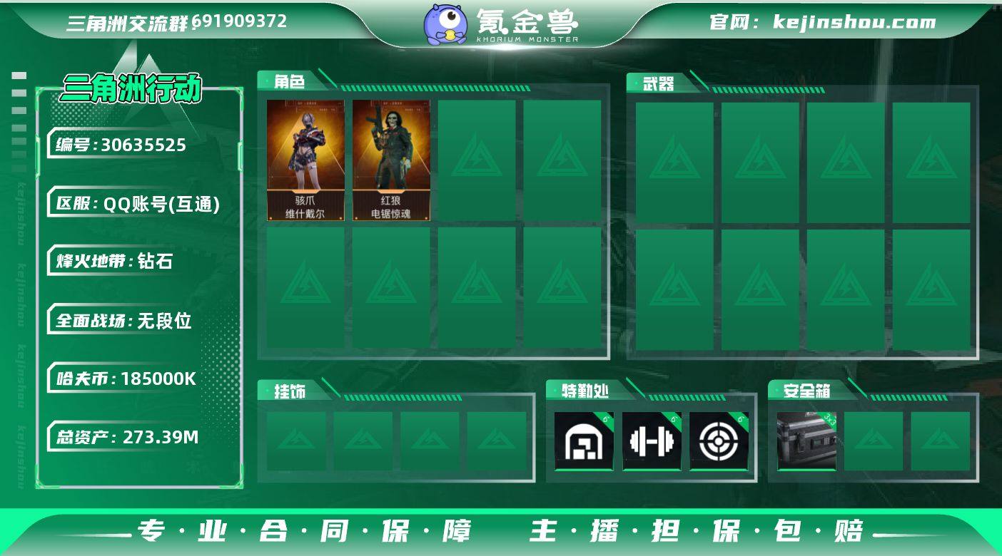 实名:不可二次实名 总资产:273.39M 哈夫币:185000K S7顶级安全箱(3x3) 烽火地带段位:钻石 烽火地带等级:60 全面战场段位:无段位 全面战场等级:0 6级仓库等级,6级训练中心等级,6级靶场等级,5级指挥中心等级,0级潜水中心等级,满级防具台等级 战术部门等级:2 战斗部门等级:2 医疗部门等级:2 研发部门等级:2 后勤部门等级:2