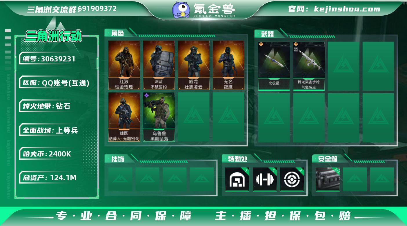 实名:不可二次实名 总资产:124.1M 哈夫币:2400K S7高级安全箱(2x3) 烽火地带段位:钻石 烽火地带等级:60 全面战场段位:上等兵 全面战场等级:37 8级仓库等级,6级训练中心等级,2级靶场等级,5级指挥中心等级,0级潜水中心等级,满级防具台等级 曼德尔砖-气象感应:1