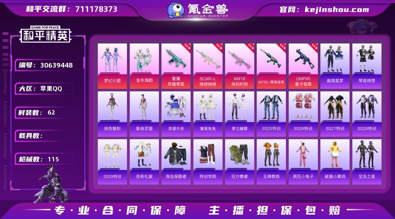 苹果【小号 粉装-梦幻火箭/粉装-金丰海韵/SCAR-L-锦绣绵绵/M416-电玩时刻/M762-青锋波束/蜜獾-异瞳寒姬】 手Q-3粉装-5特效枪-0载具-3粉色飞行器-30896热力值-5王牌印记-62套装-115枪皮 【热门品类】:粉装-梦幻火箭,套装-浪漫天命 【粉色套装】:粉装-梦幻火箭,粉装-金丰海韵 【粉色枪皮等级】:SCAR-L-锦绣绵绵(五级),M416-电玩时刻(五级),M762-青锋波束(五级),蜜獾-异瞳寒姬(五级),UMP45-量子极限(五级) 【粉色枪皮】:SCAR-L-锦绣绵绵,M416-电玩时刻,M762-青锋波束,蜜獾-异瞳寒姬,UMP45-量子极限 【粉色飞行器】:绝色倾城飞行器,极意拳锋飞行器 【粉色降落伞】:绝对恒星降落伞,梦幻火箭降落伞,萌物绒绒降落伞,莲影清波降落伞,精灵梦叶罗丽降落伞,创世·救赎降落伞,金丰海韵降落伞,未来领航者降落伞,炫彩糖果降落伞,暮色玫影降落伞 【稀有套装】:套装-雪国风尚,套装-雏菊兔兔,套装-萝兰蝴蝶,角色-绯色魅影,角色-紫俏灵猫,套装-画境星梦,套装-琴音绮想,套装-炫彩糖果 【稀有枪皮】:AUG-冰晶雪宝,AKM-龙的传人,M16A4-幻世战舞者,M16A4-蓝色火焰,SCAR-L-夜灯,SCAR-L-炫彩节奏,SCAR-L-红色方程式,M416-糯团青竹,M416-红色方程式,M416-蓝色火焰,AUG-凝视深渊,AUG-绝对恒星,M762-天降萌叽,M762-登顶巅峰,AC-VAL-快闪甜心,蜜獾-天降萌叽,ACE32-画境星梦,UZI-啾咪啾咪,UZI-天降萌叽,UZI-炫彩节奏,UMP45-夜灯,UMP45-生命誓言,UMP45-蓝色火焰,UMP45-极意拳锋,Vector-焰鹰斗篷,Vector-田园牧歌,Vector-创世·救赎,汤姆逊-天降萌叽,MP5K-画境星梦,P90-快闪甜心,P90-闪光银龙,Kar98K-彩虹符号,Kar98K-梦幻火箭,AWM-焰鹰斗篷,AWM-圣堂之誓,AWM-暮色玫影,Mini14-千面幻镜,Mini14-梦幻火箭,莫辛纳甘-蜜语绒猫,M417-惊鸿侠骨,MK20-H-快闪甜心,M200-惊鸿侠...
