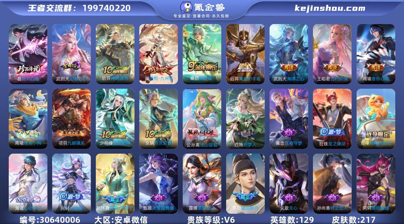 支持终身包赔 官方验号 [V6历史记录百星 英雄数量:129 皮肤数量:217金标:5个荣耀典藏:1个珍品传说:1个星传说:1个传说皮肤:7个稀有限定:15个皮肤价值:140144王者印记:17荣耀印记:6]都是女朋友送的皮肤,虽然贵六自己看吧,全英雄,武则天有星传说,朽木白哉天幕和皮肤都有,金币钻石特别多改名卡10多个,赛季战令新开的,金标5个。 安卓版本/微信/全区/全服