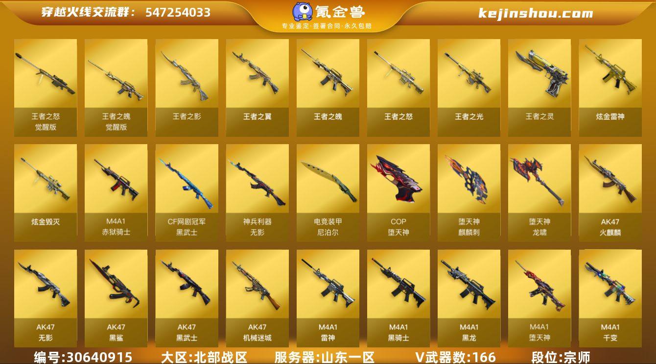 【CY40】山东一区-168V-14王者-3炫金 【传说角色】:传说艾莉莎 【热门武器】:QBZ03-金色蔷薇,HK417-朱雀,M200-幻神,死亡之眼,M4A1-黑骑士*3,汤姆逊-烈龙*3,加特林-炼狱,降世魔童,火麒麟-绝迹,COP-堕天神*2,沙鹰-修罗*5,黄金猫猫手套-白鲨 【王者炫金武器】:王者之翼,王者之影,王者之魄,王者之光,王者之怒*3,王者之灵,炫金雷神*2,炫金毁灭 【音效卡】:M200-幻神音效卡,AK47-火麒麟音效卡,M4A1-雷神音效卡,M4A1-黑骑士音效卡,Barrett-毁灭音效卡,Barrett-极光音效卡 【皮肤】:M200-幻神-黄忠皮肤,雷神-暗月,雷神-荣耀之魄,雷神-星空,雷神-机甲刑天皮肤,火麒麟-冠军之心,火麒麟-华夏之心,火麒麟-轻羽皮肤,火麒麟-心动糖果,毁灭耀金皮肤,毁灭-星空,毁灭-BEAN-2020MVP,黑龙-能量核心,无影-能量核心,战神-粉色甜心皮肤*15,战神-紫绶金章皮肤*30,战神-流金岁月皮肤*17,天龙-能量核心*2,AWM-天龙-传奇70KG,AWM-天龙-传奇白鲨,极光-能量核心,修罗-星空 【角色】:迷迭香,沙漠玫瑰,王者-瞳-闭月羞花,王者-葵-貂蝉,暗夜-X,嘉年华灵狐,斯沃特-X,蜀雪,铁骑荣耀,樱-战斗天使,职业选手 【人偶武器】:火麒麟-绝迹,巴雷特-零-水下丽影*2,AWM-灵狐-15周年嘉年华,迷你深渊冰龙,迷你牛魔王,深渊终结者手雷,闪光弹-小乔,降世魔童 【暴走生化】:死亡之眼,超级对讲机 【挑战大师】:AK47-冰龙粉碎者,冰龙粉碎者-白马银枪,VEPR-12-金魔,KAC-圣炎切割者III 【英雄级武器】:M4A1-千变,AK47-火麒麟*4,M4A1-黑龙,M4A1-雷神*2,M4A1-黑骑士*3,AK47-无影*2,AK47-黑武士,AK12-天启,AK47-机械迷城,AK47-黑鲨*2,M4A1-堕天神,HK417-朱雀,无影-神兵利器,M4A1-玫瑰精灵,QBZ03-金色蔷薇,王者之魄-觉醒版,AK-47-猩红传说*50,AK47-B-战神,白虎之魄-觉醒版,黑...