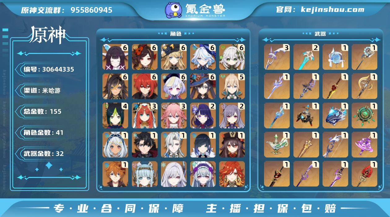 邮箱: 不送邮/死邮 总黄数: 155 冒险等级: 60 6命金色角色: 满命迪卢克,满命七七,满命莫娜,满命纳西妲,满命迪希雅,满命芙宁娜,满命娜维娅,满命千织,满命哥伦比娅 5命金色角色: 五命琴 4命金色角色: 四命提纳里 3命金色角色: 三命八重神子,三命妮露 2命金色角色: 二命刻晴,二命雷电将军 1命金色角色: 一命达达利亚,一命胡桃,一命夜兰,一命那维莱特,一命莱欧斯利,一命玛拉妮 0命金色角色: 温迪,枫原万叶,神里绫华,钟离,阿贝多,甘雨,申鹤,神里绫人,流浪者,白术,闲云,克洛琳德,希格雯,基尼奇,希诺宁,恰斯卡,玛薇卡,梦见月瑞希,丝柯克,伊涅芙 拥有武器: 天空之翼,雾切之回光,天空之卷,阿莫斯之弓,风鹰剑,天空之刃,贯虹之槊,天空之脊,护摩之杖,薙草之稻光,终末嗟叹之诗,冬极白星,赤角石溃杵,神乐之真意,若水,圣显之钥,千夜浮梦,碧落之珑,万世流涌大典,金流监督,静水流涌之辉,裁断,有乐御簾切,赦罪,苍耀,支离轮光,帷间夜曲 3精武器: 阿莫斯之弓 2精武器: 天空之刃 1精武器: 天空之翼,雾切之回光,天空之卷,风鹰剑,天空之刃,贯虹之槊,天空之脊,护摩之杖,薙草之稻光,终末嗟叹之诗,冬极白星,赤角石溃杵,神乐之真意,若水,圣显之钥,千夜浮梦,碧落之珑,万世流涌大典,金流监督,静水流涌之辉,裁断,有乐御簾切,赦罪,苍耀,支离轮光,帷间夜曲