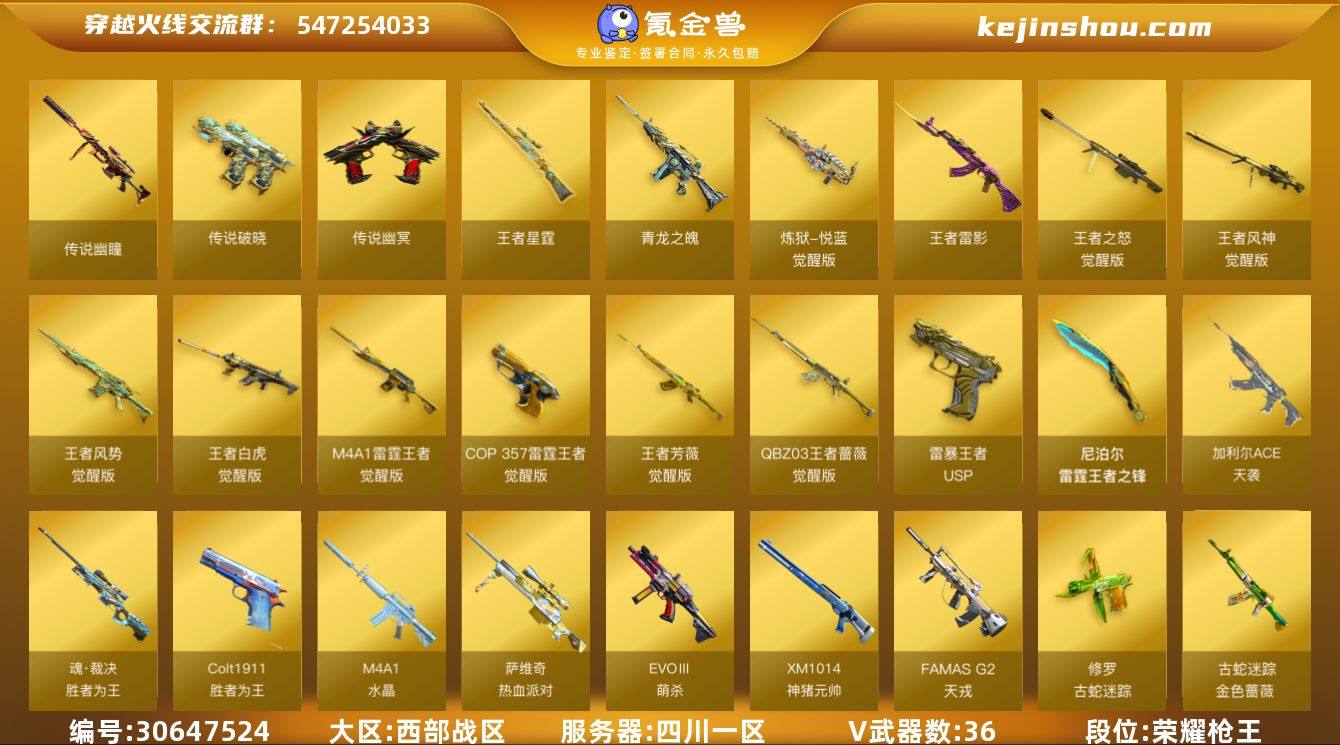 段位:荣耀枪王 VIP等级:VIP5 V武器数:36 王者武器数:15 传说破晓,传说幽冥,传说幽瞳 王者星霆,青龙之魄,炼狱-悦蓝-觉醒版,王者雷影,王者之怒-觉醒版,王者风神-觉醒版,王者风势-觉醒版,王者白虎-觉醒版,M4A1-雷霆王者-觉醒版,COP 357-雷霆王者-觉醒版,王者芳薇-觉醒版,QBZ-03-王者蔷薇-觉醒版,USP雷暴王者,雷霆王者之锋 Colt1911-胜者为王,EVOⅢ-萌杀,魂·裁决-胜者为王,加利尔ACE-天袭,M4A1-水晶,萨维奇-热血派对,XM1014-神猪元帅,FAMAS G2-天戎,修罗-古蛇迷踪,金色蔷薇-古蛇迷踪,COP 357-幻灵,无影-神兵利器,超新星-热带奇洋,龙啸-热带奇洋,USP-小动物,云龙扇,QBZ03-云龙,AK47-黑武士-锦绣游龙,AK47-火麒麟,M4A1-雷神,M4A1-黑骑士,M4A1-黑龙,M4A1-青龙,M200-幻神,Barrett-毁灭,Barrett-极光,AWM-天龙,Kar98k-星神,AA-12-雷霆,HK417-朱雀,QBZ03-金色蔷薇,屠龙,龙啸,麒麟刺,炽芒蝶刃,Barrett-暗月传说,幻灵之锋,裁决,柯尔特-冠军之特,G36C-幻影,龙啸-烈火龙威 传说影煞 王者葵-惊若翩鸿,王者-零-华冠丽服,王者潘多拉,王者樱-热浪之夏 关小雨,灵动武士,零,隼,王者春,研,隐,战地猎狐 M14EBR-玄武音效卡,黑龙-古蛇迷踪音效卡,QBZ03-金色蔷薇-古蛇迷踪音效卡,M200-幻神音效卡,M4A1-黑骑士音效卡,Barrett-极光音效卡,Barrett-毁灭音效卡,M4A1-雷神音效卡