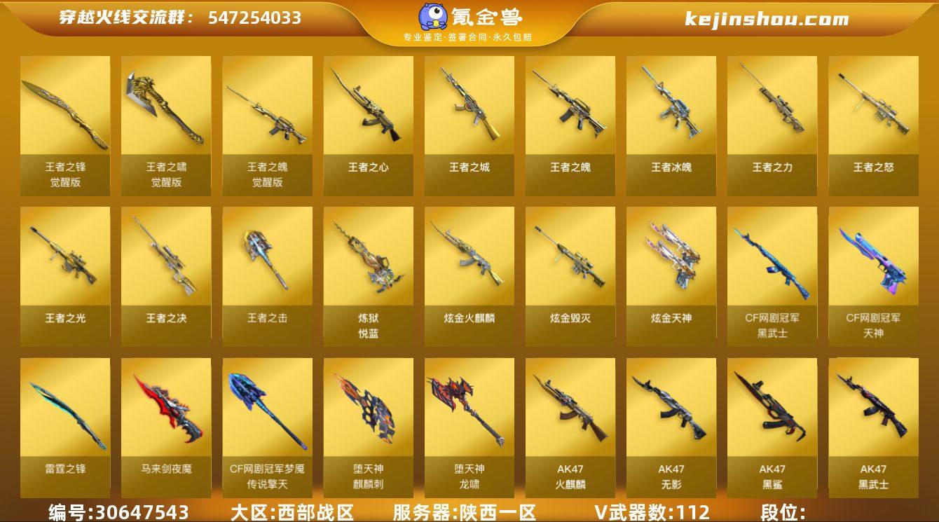 西部战区(陕西一区)ys【爆破生化号】传说【传说光耀】112v【M200-幻神,Kar98k-星神,CF网剧冠军套装,QBZ03-金色蔷薇,AWM-裁决,HK417-朱雀,6烈龙+4炼狱+死亡之眼,colt1911-大黄蜂,胡萝卜匕首】14王者【王者之城,王者之心,王者冰魄,王者之魄,王者之光,王者之决,王者之力,王者之怒,王者之锋,王者之击,王者之啸,炼狱-悦蓝】6炫金【炫金火麒麟,炫金毁灭,炫金天神】10角色【四防王者-葵-貂蝉,葵,零,迷迭香,审判者,魅影,狐影,王者-瞳-闭月羞花,王者-零,新海豹突击队】4音效【Barrett-毁灭音效卡,AK47-火麒麟音效卡,M4A1-黑骑士音效卡,M4A1-雷神音效卡】60皮【雷神-机甲刑天,毁灭-星空,修罗-CFS2018,黑骑士-冠军之势,火麒麟-CFS2018,雷神-星空,AK47-火麒麟-传奇EVEN,毁灭-AG-CFPLS15冠军,AWM-天龙-传奇70KG,雷神-白鲨-CFPLS14冠军,屠龙-荣耀之锋,AK47-黑武士-361,火麒麟-华夏之心,AWM-天龙-传奇白鲨,雷神-虎将,火麒麟-冠军之心】截图展示段位不代表实际段位 如赛季更新等不可抗拒因素发生变化、时限道具不保证所剩时间
