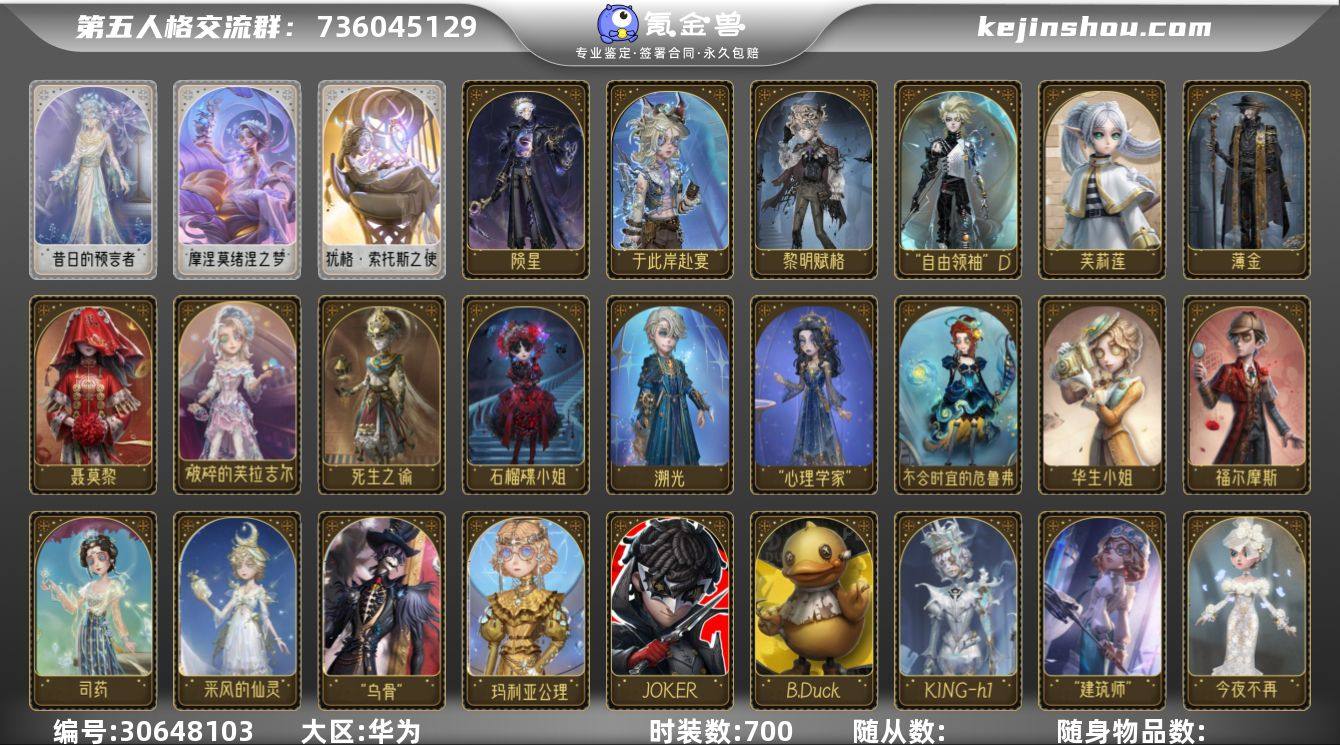 时装数:700 先知-昔日的预言者,调香师-摩涅莫绪涅之梦,祭司-犹格·索托斯之使 愚人金-陨星,幻灯师-于此岸赴宴,囚徒-黎明赋格,台球手-自由领袖D,气象学家-芙莉莲,隐士-薄金,调香师-聂莫黎,调酒师-破碎的芙拉吉尔,“逃脱大师”-死生之谕,小女孩-石榴碟小姐,病患-溯光,“心理学家”-恒梦,弓箭手-不合时宜的危鲁弗,记者-华生小姐,小说家-福尔摩斯,医生-司药,气象学家-采风的仙灵,“杰克”-乌骨,盲女-玛利亚公理,杂技演员-JOKER,26号守卫-B.Duck,木偶师-KING-h1,盲女-"建筑师",调香师-今夜不再,时空之影-墨菲斯的门廊 卖家说:标价慢出会一直养的可以刀归宿都花了8k+,5万氪/60w+大归宿/近一年的限定金都有/ 可小刀/超绝连体号逆水寒/哈利波特等游戏都有充值K往上的号
