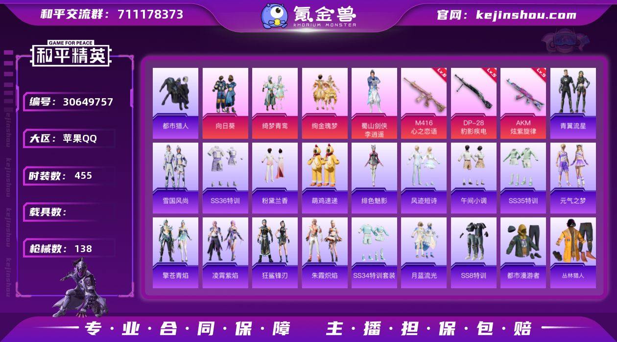 热力值:41078 时装数:455 枪械数:138 战备数:89 游戏等级:61 卓越印记:1 传奇印记:0 绝世印记:0 绮梦青鸾,蜀山剑侠-李逍遥,绚金瑰梦,向日葵 六级M416-心之恋语,五级DP-28-豹影疾电,五级AKM-炫紫旋律 炫彩糖果降落伞,炫彩糖果飞行器,无垠阁降落伞,暗翼战神飞行器,古堡领主飞行器,彩虹甜喵降落伞,春暖花开降落伞,古堡领主降落伞,绮梦青鸾降落伞,深海曼妙降落伞,绚金瑰梦降落伞 青翼流星,雪国风尚,SS36特训,炫彩糖果,粉黛兰香,绯色魅影,萌鸡速递,风迹短诗,SS35特训,午间小调,元气之梦,狂鲨锋刃,凌霄紫焰,擎苍青焰,SS34特训套装,朱霞炽焰,阿奴,冰冻风暴,北国孤狼,白色伏地魔,白熊同盟,白月香洋装,长空猛禽,丛林猎人,春日漫步,都市猎人,都市漫游者,风华少年志,疯狂小兔子,风行保卫者,格斗先锋,海岛探路者,红酒骑士,黑色伏地魔,海上生明月,黄色运动,红色运动,幻世战舞者,海洋之心,橘黑制服,竞技名士,酒剑仙,激萌罗小黑,决胜时刻,街头潮人,酷潮明星,空投萌叽,绿翡凌光,冷酷挑战者,玲珑飞花,蓝色运动,龙腾端午,李逍遥,林月如,漫步者,魅力单车,麻辣教官,梦起落英,萌趣咩咩,迷域探索者,逆风勇士,霓虹街区,怒火燎原,牛气冲天,牛气满满,破蛋小黄鸡,青春校园,骑行爱好者,瑞龙福将,深蓝冒险家,沙漠毒蛇,神秘黑猫,沙漠雄狮,SS10特训,SS11特训,SS12特训,SS13特训,SS17特训,SS18特训,SS19特训,SS21特训,SS7特训,SS8特训,SS9特训,时尚圣诞,水银刺客,甜蜜告白,特训学院,团圆交子,特战装甲,舞夜骑士,西部风情,星河入梦,夏日音浪,雪山精英,迎春赐吉,原初圣火,摇滚狂鲨,摇滚舞王,月蓝流光,鹰眼刺客,夜莺强袭者,智慧之神,赵灵儿,众神之王,灼焰舞者 ACE32-冰晶雪宝,MK12-乌木金纹,AUG-冰晶雪宝,铝热弹-炫彩糖果,UZI-炫彩糖果,撬棍-冰晶雪宝,AKM-霓彩脉冲,Famas-霓彩脉冲,Mk14-紫晶流影,SLR-霓彩脉冲,SVD-霓彩脉冲,DBS-风迹短诗,蜜獾-风迹短诗,MK12-风迹短诗,Mk47-风迹短诗,莫辛纳甘-风迹短诗,破片手榴弹-拽到爆炸,S12K-霓彩脉冲,SCAR-L-彩虹符号,AKM-涂鸦街区,破片手榴弹-火尖莲影,撬棍-火尖枪,AMR-喜羊羊与灰太狼,爆炸猎弓-喜羊羊与灰太狼,M249-冰晶雪宝,MG-36-薄荷星砂,P90-玩趣呆呆,AC-VAL-天降萌叽,AKM-彩虹符号,AKM-虎虎生威,AKM-霓虹街区,AKM-影袭,ARX-凌霄紫焰,AWM-不夜海上花,AWM-恐龙拽拽,DP-28-原初圣火,G36C-不夜海上花,G36C-绮梦青鸾,GROZA-马卡龙,GROZA-影袭,JS9-凌霄紫焰,Kar98K-古堡领主,Kar98K-深海曼妙,Kar98K-炫彩节奏,Kar98K-勇闯险境,Kar98K-影袭,M16A4-幻世战舞者,M249-无面战甲,M24-影袭,M24-众神之王,M416-仓鼠灰灰,M416-夜灯,M762-牛气冲天,M762-瑞龙福将,M762-深海曼妙,MG-36-凌霄紫焰,MG3-幻世战舞者,MG3-瑞龙福将,蜜獾-娇憨猪猪,Mini14-海渊国主,Mini14-金鼠迎春,Mini14-绮梦青鸾,Mini14-原初圣火,Mk14-绚金瑰梦,MK20-H-狂鲨锋刃,MP5K-众神之王,P18C-原初圣火,P1911-绮梦青鸾,P92-凌霄紫焰,平底锅-缤纷糖果,平底锅-不夜海上花,平底锅-娇憨猪猪,平底锅-凌