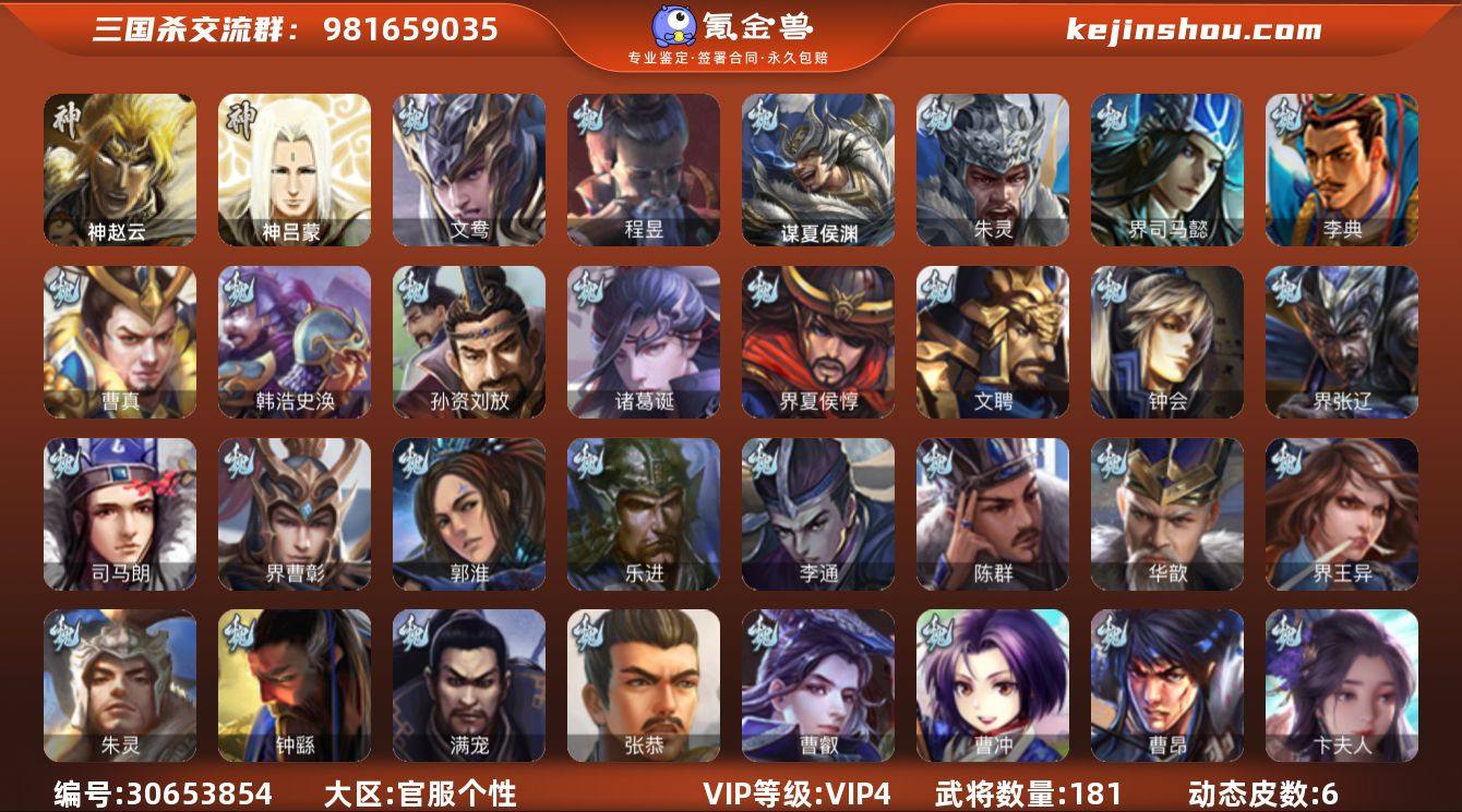 VIP等级: VIP4 官阶: 中军将军 武将数量: 181 动态皮肤数量: 6 神将: 神赵云,神吕蒙 魏国武将: 程昱,文鸯,徐庶,张辽,SP关羽,SP姜维,SP庞德,卞夫人,曹昂,曹操,曹冲,曹丕,曹仁,曹叡,王异,张恭,满宠,钟繇,郭嘉,荀彧,朱灵,界王异,华歆,陈群,李通,乐进,郭淮,界曹彰,夏侯惇,曹植,司马朗,许褚,界张辽,张郃,钟会,文聘,界夏侯惇,诸葛诞,司马懿,甄姬,徐晃,孙资刘放,韩浩史涣,曹真,典韦,夏侯渊,李典,于禁,邓艾,界司马懿,朱灵(国战),谋夏侯渊 蜀国武将: 徐庶,杨仪,赵云,张松,界刘备,刘封,黄月英,关羽,吴懿,吴班,张飞,魏延,马忠,刘禅,SP徐庶,周仓,界关兴张苞,诸葛亮,法正,界马岱,关平,马岱,界庞统,庞统,诸葛果,马谡,马超,廖化,关兴张苞,孟获,姜维,黄忠,刘备,界马超,马良,甘夫人,SP甘夫人 吴国武将: 界徐盛,界朱然,文鸯,周泰,吕蒙,诸葛恪,界顾雍,丁奉,蒋钦,顾雍,孙休,界孙权,祖茂,陈武董袭,凌操,孙尚香,程普,大乔,韩当,陆逊,诸葛瑾,朱然,吕范,界黄盖,孙鲁班,界周瑜,卫温诸葛直,孙权,界甘宁,界韩当,吴国太,甘宁,界大乔,孙坚,孙鲁育,步练师,周瑜,小乔,潘璋马忠,黄盖,界陆逊,张昭张纮,陈武蕫袭,孙邵,朱桓 群国武将: 麹义,伏完,华雄,董白,袁术,高顺,界庞德,于吉,界公孙瓒,董承,吕布,星徐晃,李儒,公孙瓒,SP赵云,阎圃,蔡夫人,界袁术,陈宫,蹋顿,界华佗,贾诩,庞德,张宝,刘表,董卓,何太后,张角,卢植,袁绍,华佗,刘虞,貂蝉,郭图逢纪,丁原,界吕布,严白虎,公孙渊,韩遂,颜良文丑,张鲁,张任,邹氏,田丰,势田丰,乐就