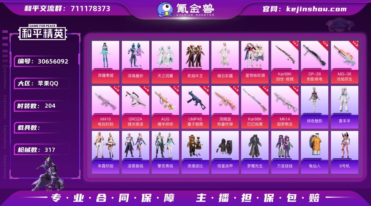 苹果 手Q-6粉装-10特效枪-0载具-4粉色飞行器-96841热力值-15王牌印记-204套装-317枪皮 【热门品类】:套装-龟仙人,套装-浪漫波比,角色-8号机 【粉色套装】:粉装-深海曼妙,粉装-天之羽翼,粉装-炙焰牛王,角色-烟云彩露,粉装-星穹咏叹调,角色-异瞳寒姬 【粉色枪皮等级】:M416-电玩时刻(五级),GROZA-镜光银凌(五级),AUG-暖羊咩咩(五级),UMP45-量子极限(五级),汤姆逊-热量炸弹(五级),Kar98K-创世·救赎(七级),Kar98K-巳巳如意(五级),Mk14-甜梦熊击(五级),DP-28-豹影疾电(五级),MG-36-沧焰双生(五级) 【粉色枪皮】:M416-电玩时刻,GROZA-镜光银凌,AUG-暖羊咩咩,UMP45-量子极限,汤姆逊-热量炸弹,Kar98K-创世·救赎,Kar98K-巳巳如意,Mk14-甜梦熊击,DP-28-豹影疾电,MG-36-沧焰双生 【粉色飞行器】:星空武士飞行器,墨金战记飞行器,时光之吻飞行器 【粉色降落伞】:深海曼妙降落伞,粉色回忆降落伞,春暖花开降落伞,阿狸红降落伞,星夜魔法师降落伞,未来歌姬降落伞,精灵梦叶罗丽降落伞,创世·救赎降落伞,金丰海韵降落伞,忍者神龟降落伞,月影灵韵降落伞,炫彩糖果降落伞 【稀有套装】:套装-龟仙人,套装-雪国风尚,套装-雏菊兔兔,套装-萝兰蝴蝶,套装-糖糖葫芦,套装-青团波波,套装-棉花软糖,套装-燕燕于飞,套装-鱼渊荷华,套装-粉恋花,套装-紫幽梦,套装-蓝冰羽,套装-霓虹热舞,套装-极速光影,套装-彩虹兔,套装-云朵鹅,套装-雪绒豹,套装-朱霞炽焰,套装-凌霄紫焰,套装-擎苍青焰,玩偶服-喜羊羊,角色-绯色魅影 【稀有枪皮】:AKM-夜灯,AKM-江南烟雨,AKM-生命誓言,AKM-破晓战魂,AKM-虎虎生威,AKM-霓虹街区,M16A4-幻世战舞者,M16A4-快乐主宰,M16A4-甜心亚梦,M16A4-蓝色火焰,M16A4-魔法学院,SCAR-L-暗夜玫瑰,SCAR-L-生命誓言,SCAR-L-红色方程式,SCAR-L-雷霆特警,M...
