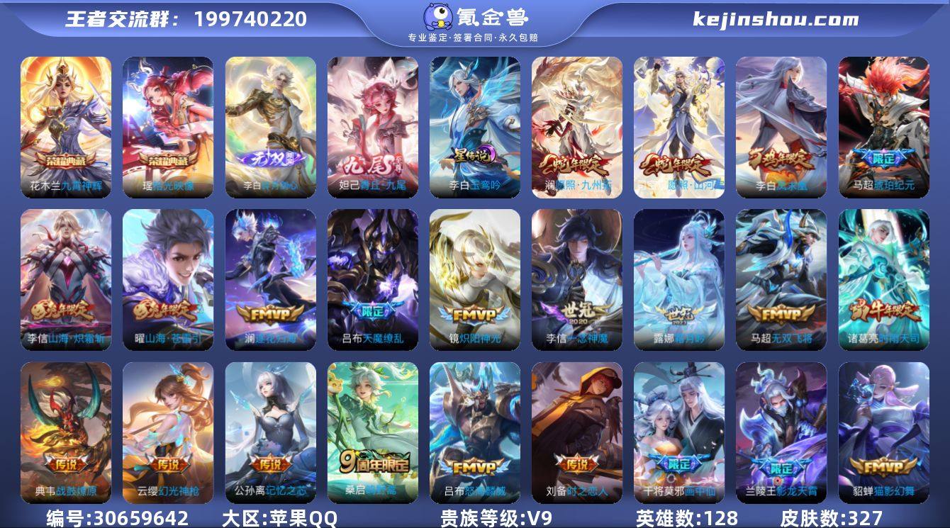 【高性价比·万战艾琳·金标李白·九霄神辉·瑶拾光映像·碎月剑心·青丘九尾·愿照山河定·澜愿照九州拓·马超琥珀纪元·澜逐花归海·霜月吟·影龙天霄·记忆之芯·画中仙·无双飞将·时雨天司·可二次】YXw11621-苹果Q-128英雄-327皮肤-11王者印记-250铭文-贵族积分10w【贵族9】【2典藏·2无双·2星传说·29传说·6按键】【因赛季更新游戏段付以上号为准!】 【英雄全皮】:李信全皮,澜全皮,司空震全皮,空空儿全皮 【荣耀典藏】:花木兰九霄神辉,瑶拾光映像 【无双皮肤】:妲己青丘九尾,李白碎月剑心 【星元皮肤】:李白玉鸾吟,刘备时之思念 【传说皮肤】:司空震愿照山河定,澜愿照九州拓,云缨幻光神枪,桑启鸣野蒿,典韦战鼓燎原,马超琥珀纪元,澜逐花归海,露娜霜月吟,兰陵王影龙天霄,澜电玩雷克斯,公孙离记忆之芯,干将莫邪画中仙,花木兰燃星之曲,曜山海苍雷引,李信山海炽霜斩,吕布怒海麟威,马超无双飞将,赵云淬星耀世,王昭君乞巧织情,诸葛亮时雨天司,铠绛天战甲,镜炽阳神光,虞姬启明星使,孙悟空零号赤焰,李信一念神魔,刘备时之恋人,貂蝉猫影幻舞,李白凤求凰,吕布天魔缭乱 【限定皮肤】:姜子牙天穹之誓,李白谪仙醉月,狄仁杰阴阳师,赵云皇家上将,墨子神迹守卫,高渐离死亡摇滚,高渐离玩趣恶龙,钟无艳超时空战士,扁鹊奇幻香踪,吕布天魔缭乱,元歌无心,甄姬落雪兰心,马可波罗暗影游猎,马可波罗山海玄木吟,狄仁杰魔术师,狄仁杰万华元夜,项羽海滩派对,老夫子航海奇遇记,关羽百相守梦,程咬金演武夺筹,韩信飞衡,兰陵王影龙天霄,兰陵王金庭之子,花木兰默契交锋,花木兰燃星之曲,孙悟空至尊宝,孙悟空零号赤焰,孙悟空孙行者,李元芳银河之约,李元芳云中旅人,虞姬启明星使,钟馗驱傩正仪,杨戬潮玩骑兵,干将莫邪胡桃夹子,干将莫邪画中仙,太乙真人华丽摇滚,鬼谷子五谷丰年,诸葛亮...