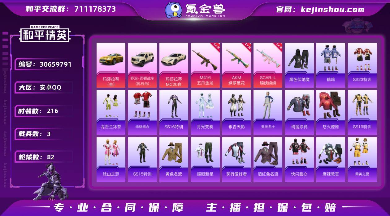 热力值:25728 载具数:3 时装数:216 枪械数:82 战备数:45 游戏等级:57 卓越印记:0 传奇印记:0 绝世印记:0 五级AKM-绿萝繁花,五级M416-五爪金龙,四级SCAR-L-锦绣绵绵 玛莎拉蒂Ghibli(金),玛莎拉蒂MC20(星石白),乔治·巴顿战车(乳石白) 第五大道降落伞,烈焰拳霸降落伞,王牌四分卫降落伞 暗夜傀儡,春光漫游,长空猛禽,超人强,绯格组合,格斗先锋,鹤鸣,湖蓝色名流,黑色伏地魔,黄色名流,灰色守护者,幻世战舞者,酒红色名流,竞技名士,吉莉礼服,空岛之星,快闪甜心,龙的传人,龙舌兰冰茶,莱茵河畔,萌黄之夏,魅力单车,麻辣教官,懵萌河马,梦起落英,霓虹街区,怒火燎原,绮丽涂鸦,骑行爱好者,深蓝色名流,沙漠兵团,神气柴柴,SS14特训,SS15特训,SS16特训,SS17特训,SS18特训,SS19特训,SS20特训,SS21特训,SS23特训,SS24特训,SS25特训,SS26特训,甜蜜告白,涂山之恋,星河入梦,月光变奏,玉兔迎春,银杏天影,野性战心,耀眼新星 AC-VAL-快闪甜心,AC-VAL-天降萌叽,AKM-龙的传人,AKM-破晓战魂,AMR-超新星,AUG-天降萌叽,DBS-圣堂之誓,大砍刀-雪梅暗香,DP-28-彩虹符号,DP-28-闪光银龙,DP-28-旋转彩虹,G36C-懵萌河马,GROZA-懵萌河马,GROZA-影袭,Kar98K-红色方程式,M16A4-红色方程式,M16A4-幻世战舞者,M16A4-蓝色火焰,M16A4-夜灯,M200-雪梅暗香,M249-彩虹符号,M249-破晓战魂,M416-蓝色火焰,M416-糯团青竹,MG3-第五大道,MG3-幻世战舞者,Mini14-耀粉歌者,Mini14-炫彩节奏,Mini14-旋转彩虹,MK20-H-快闪甜心,MP5K-彩虹嘻嘻猴,MP5K-繁花小夜曲,莫辛纳甘-懵萌河马,P1911-创世·救赎,P90-快闪甜心,P90-闪光银龙,平底锅-快闪甜心,平底锅-懵萌河马,PKM-懵萌河马,QBZ-洛神天依,QBZ-赛罗,S12K-幻世战舞者,S12K-破晓战魂,SCAR-L-红色方程式,SCAR-L-玉兔迎春,SKS-糯团青竹,SKS-炫彩节奏,沙漠之鹰-快闪甜心,汤姆逊-天降萌叽,汤姆逊-耀粉歌者,UMP45-蓝色火焰,UMP45-生命誓言,UMP45-涂山之恋,UMP45-猪猪侠,UZI-红色方程式,UZI-啾咪啾咪,UZI-墨染幽兰,UZI-天降萌叽,Vector-彩虹符号,Vector-生命誓言,VSS-繁花小夜曲,蝎式手枪-幽秘魅影 粉色滑翔尾迹,快闪甜心降落伞,懵萌河马降落伞 实名:可二次实名